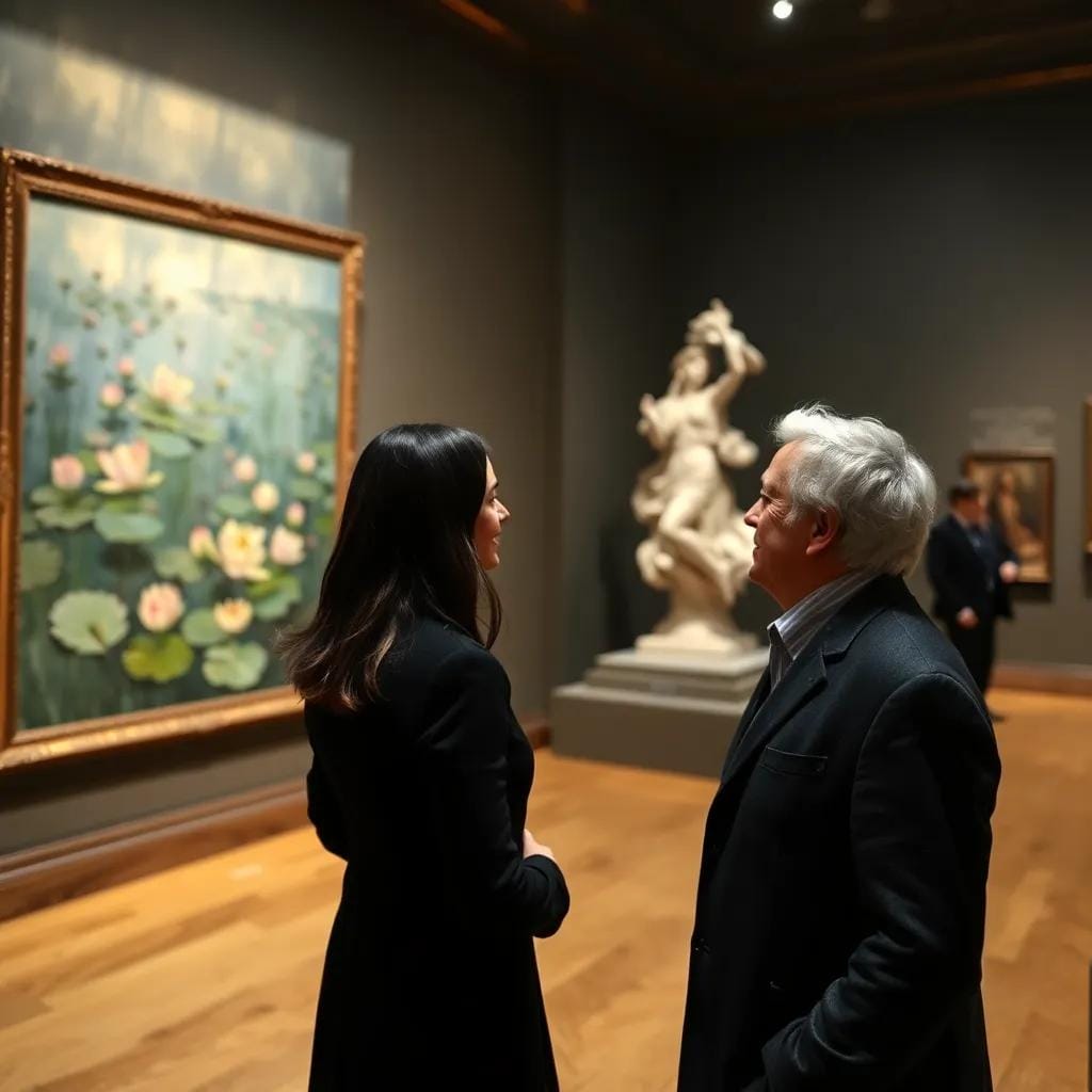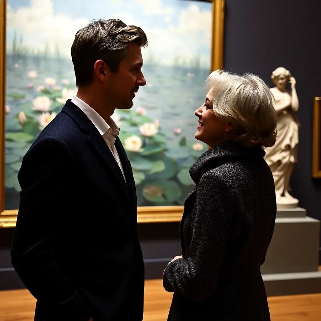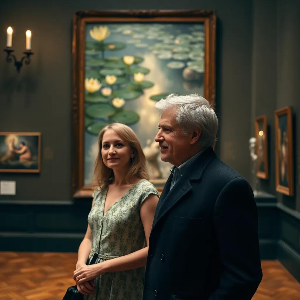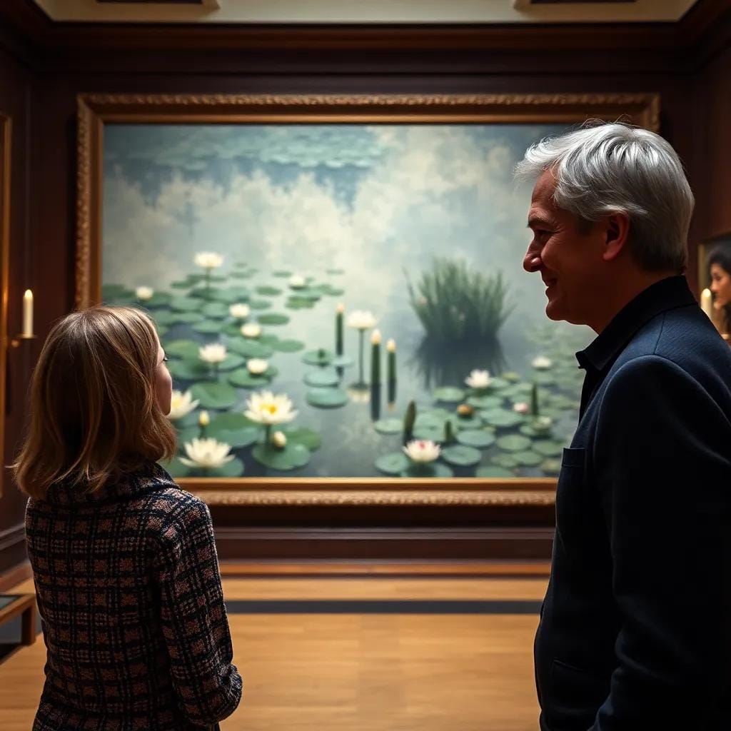 In the hushed, candlelit galleries of the city's esteemed museum, Emma stood entranced before a majestic Monet, her gaze drifting across the soft, dreamy hues of his water lilies. Beside her, the quiet, introspective atmosphere was pierced by the low, resonant voice of James, a gentle, silver-haired art historian who had taken her on a private tour of the museum's collection. As they strolled through the galleries, James pointed out the finer details of each piece, his words a gentle, soothing accompaniment to the beauty that surrounded them.