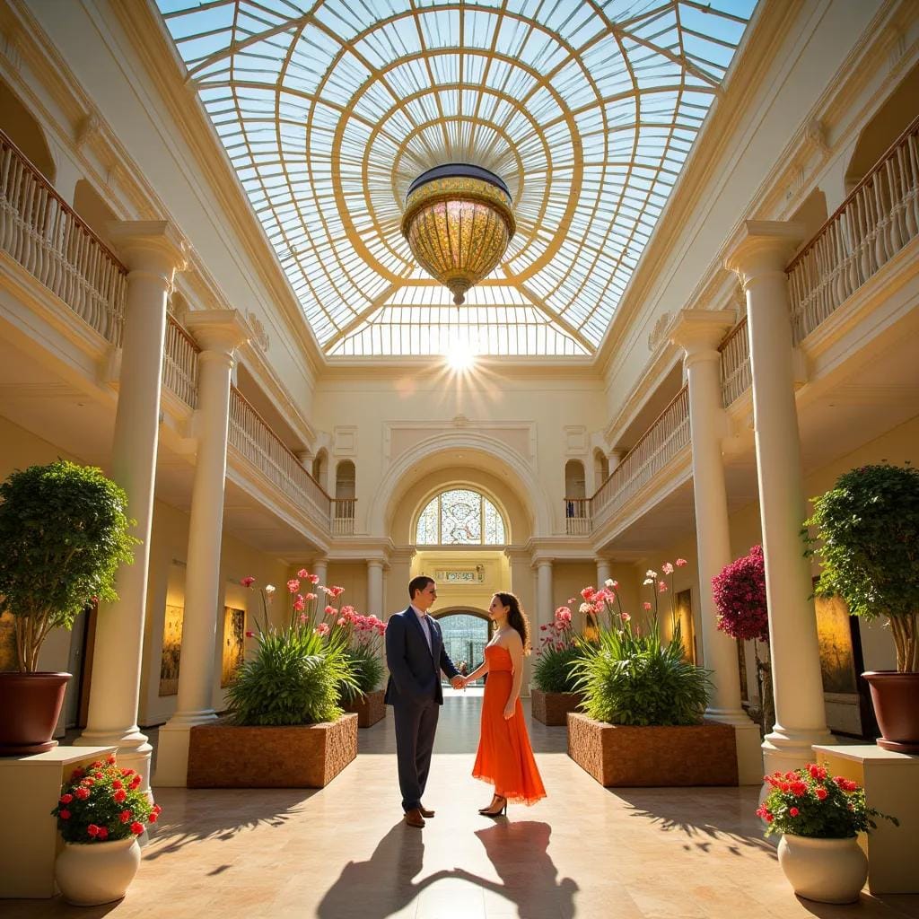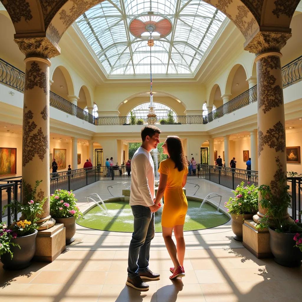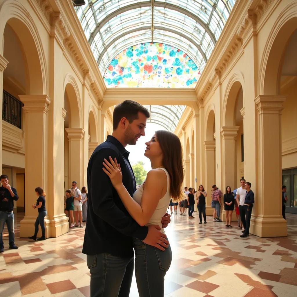 In the grand, sun-drenched atrium of the Bellwether Museum, amidst a tapestry of masterpieces, Emilia and Julian found themselves entwined in a dance of discovery. The museum's latest exhibition, "The Ephemeral Nature of Beauty," had drawn them in, like moths to a flame, each step a testament to their growing connection. As they wandered through the galleries, their fingers brushed against each other, sending shivers down their spines.