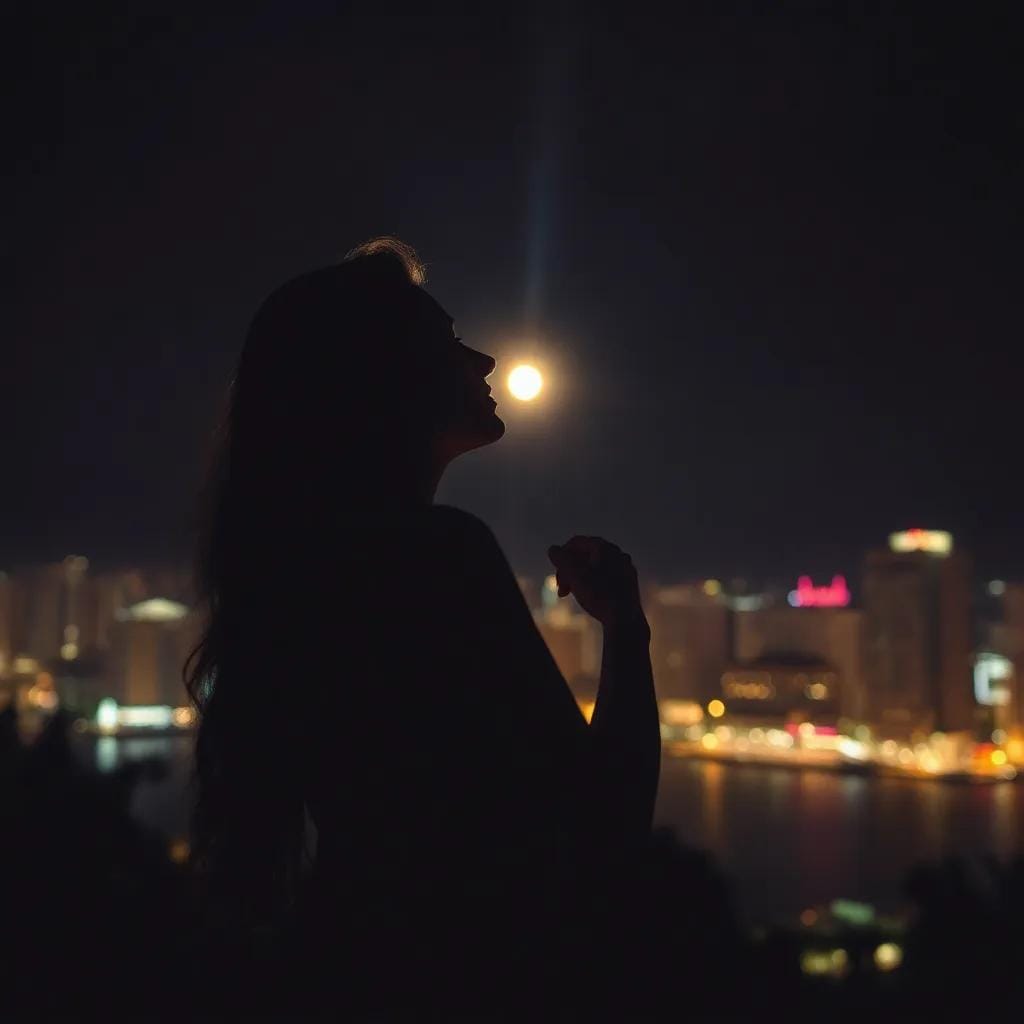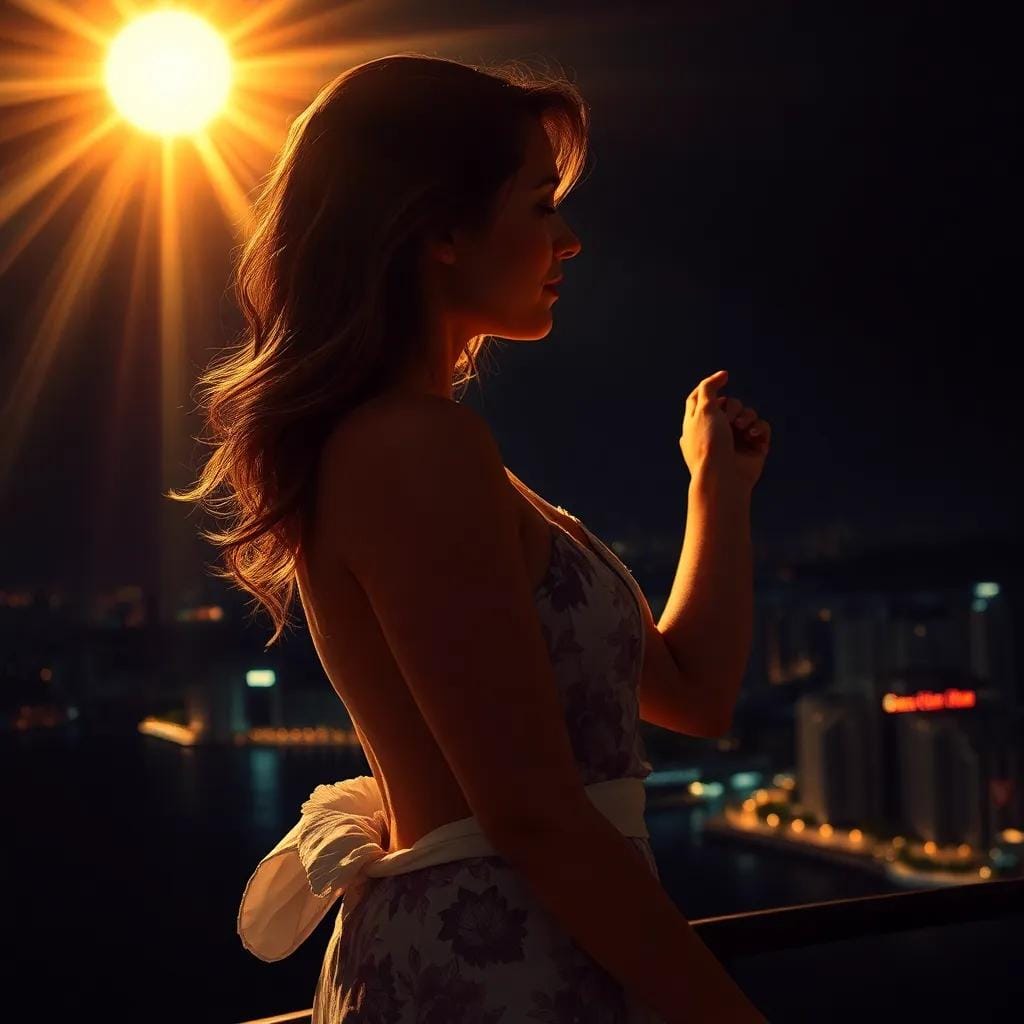 The velvety darkness of the night was pierced by a radiant beam, a celestial kiss that illuminated the canvas of the city. Sun in the night, everyone is together, ascending into the heavens, life is forever.