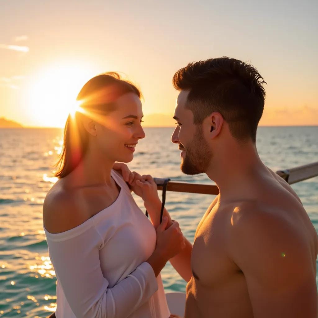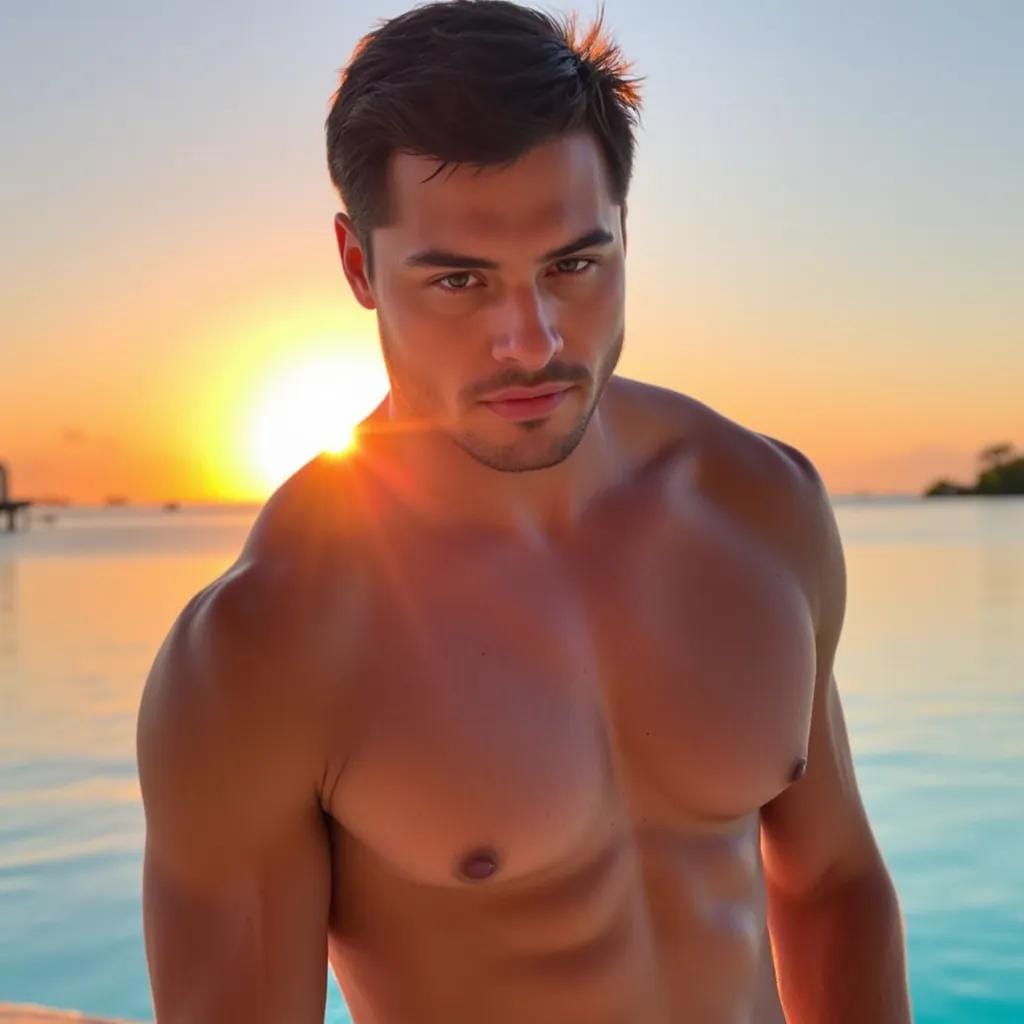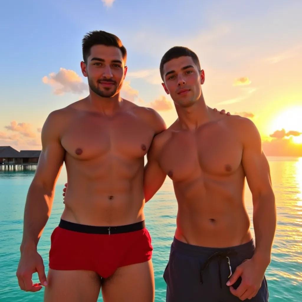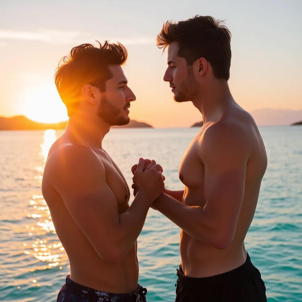The sun had just begun to set over the crystal-clear waters of Bora Bora, casting a warm orange glow over the luxurious overwater bungalow where Alessandro and Ryder had spent the past week in blissful seclusion. As they sat on the private deck, sipping champagne and watching the sea turtles swim lazily beneath them, Ryder's eyes locked onto Alessandro's chiseled jawline, his strong features illuminated by the fading light. Alessandro, sensing Ryder's gaze, turned to him with a sultry smile, his eyes flashing with desire.