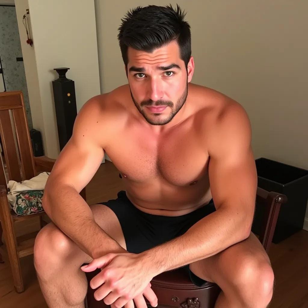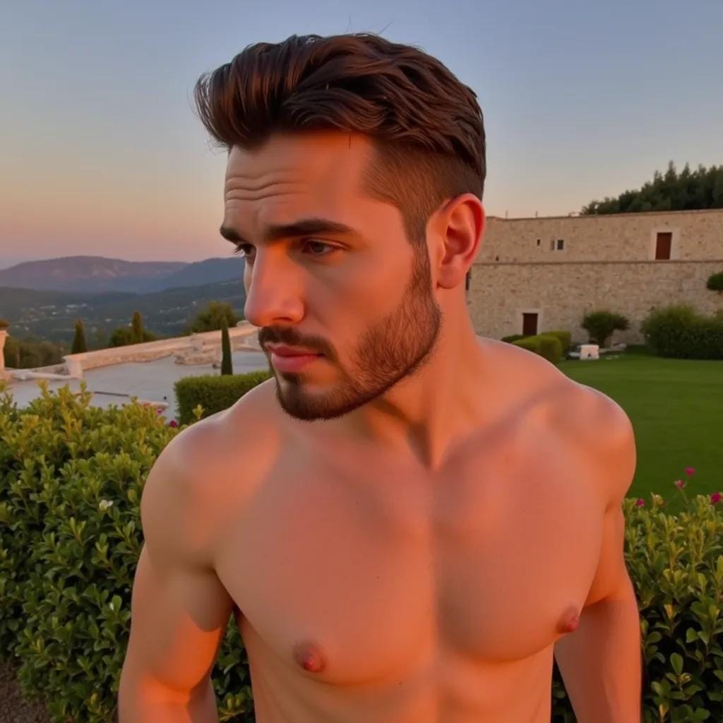 His bronzed physique glistened in the fading light as he gazed out at the rolling vineyards below. His broad shoulders and chiseled jawline seemed carved from the very stone of the Italian countryside. As he turned to greet me, his eyes locked onto mine with a piercing intensity that sent shivers coursing through my veins.