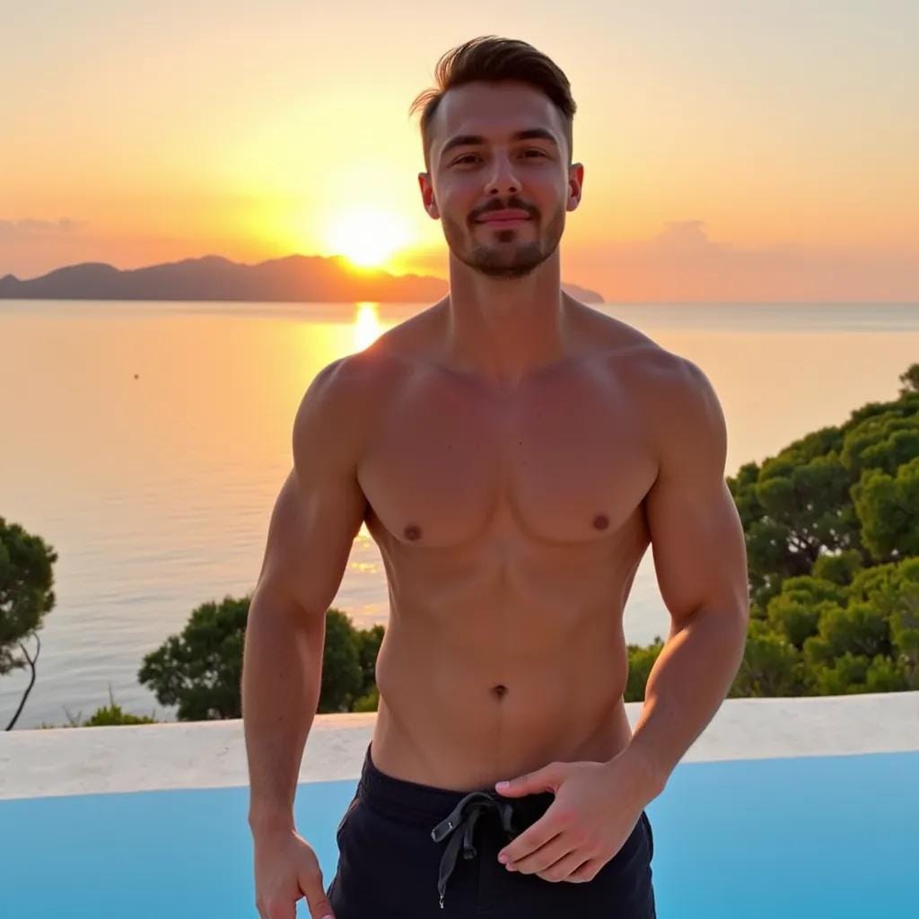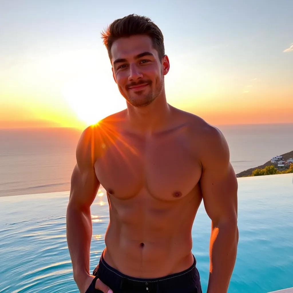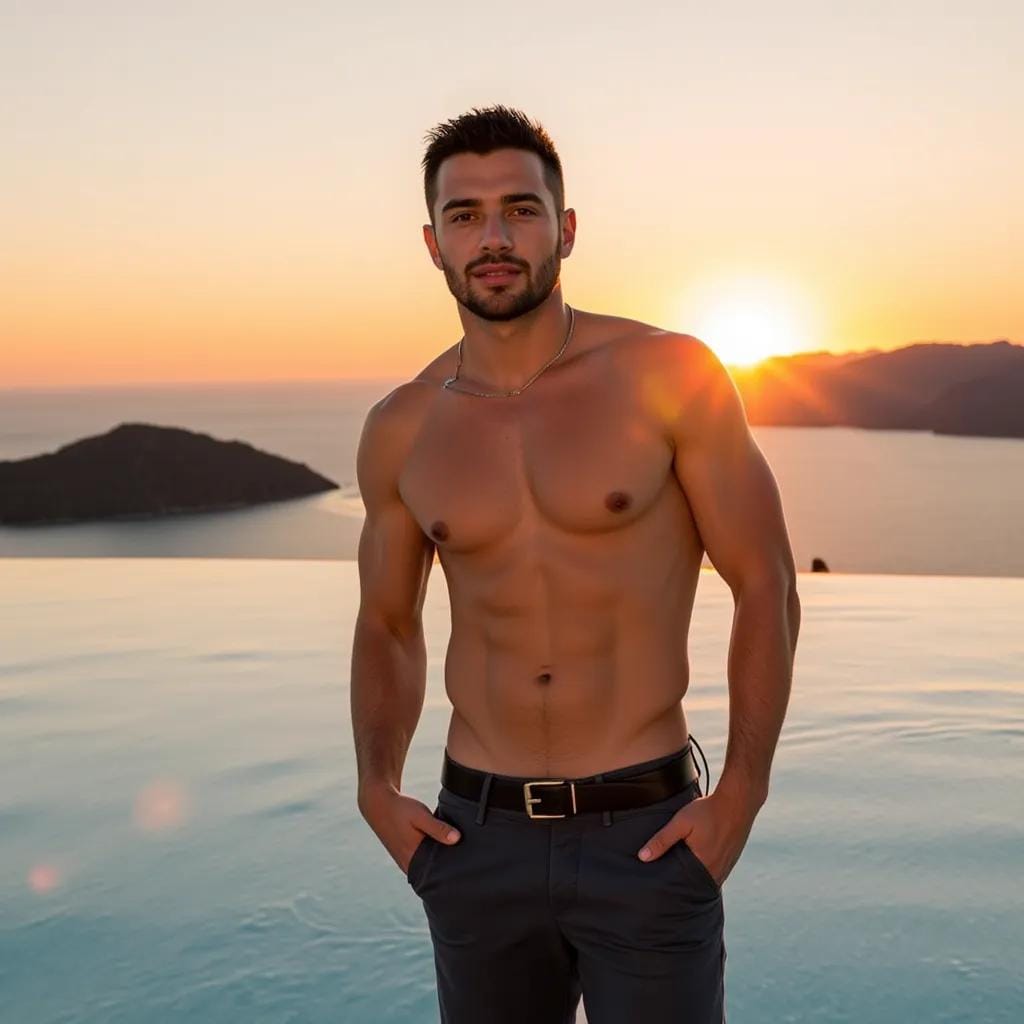 Before me, my companion, Alessandro, reclined on a plush chaise lounge, his bronzed body glistening with the faint sheen of sweat. As I poured a glass of chilled champagne, he rose to his feet, his eyes never leaving mine. His rugged jawline was set in a determined line, and I could feel the tension in his muscles as he moved closer.