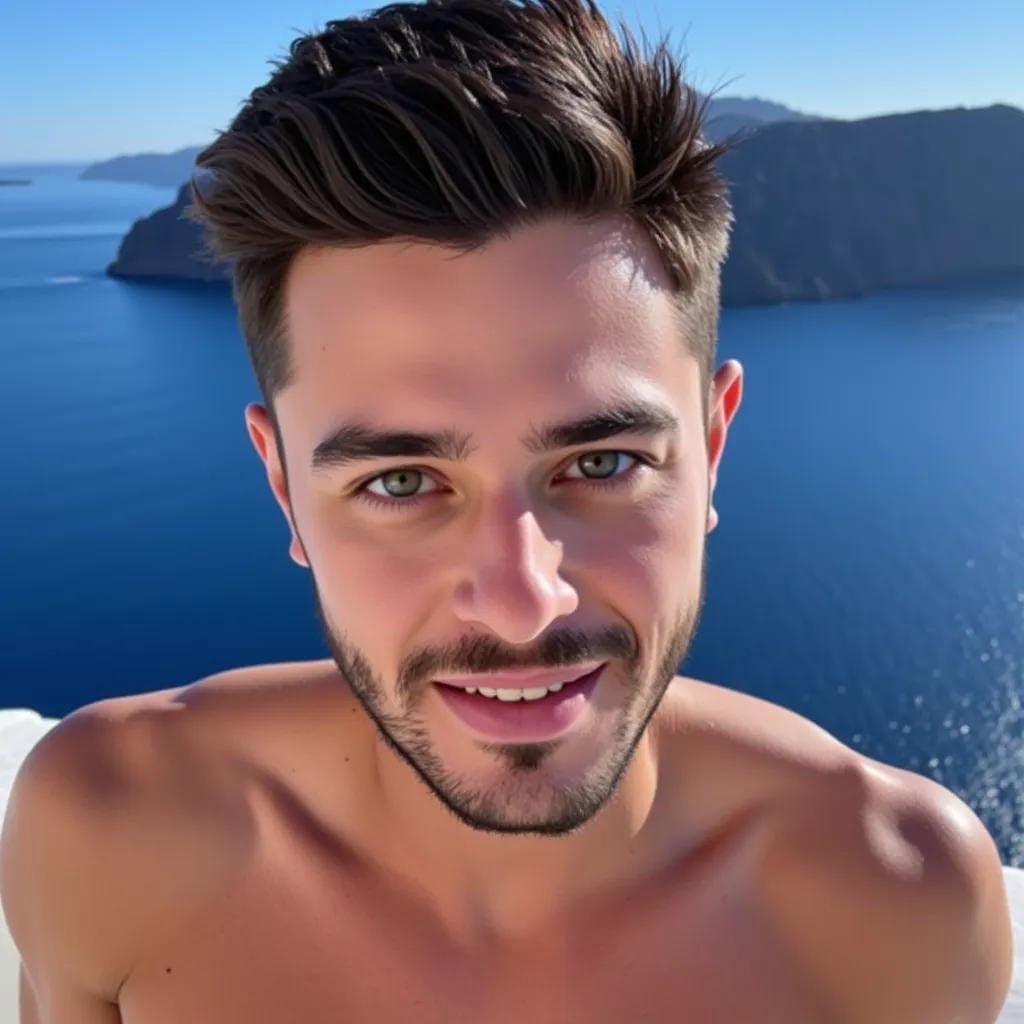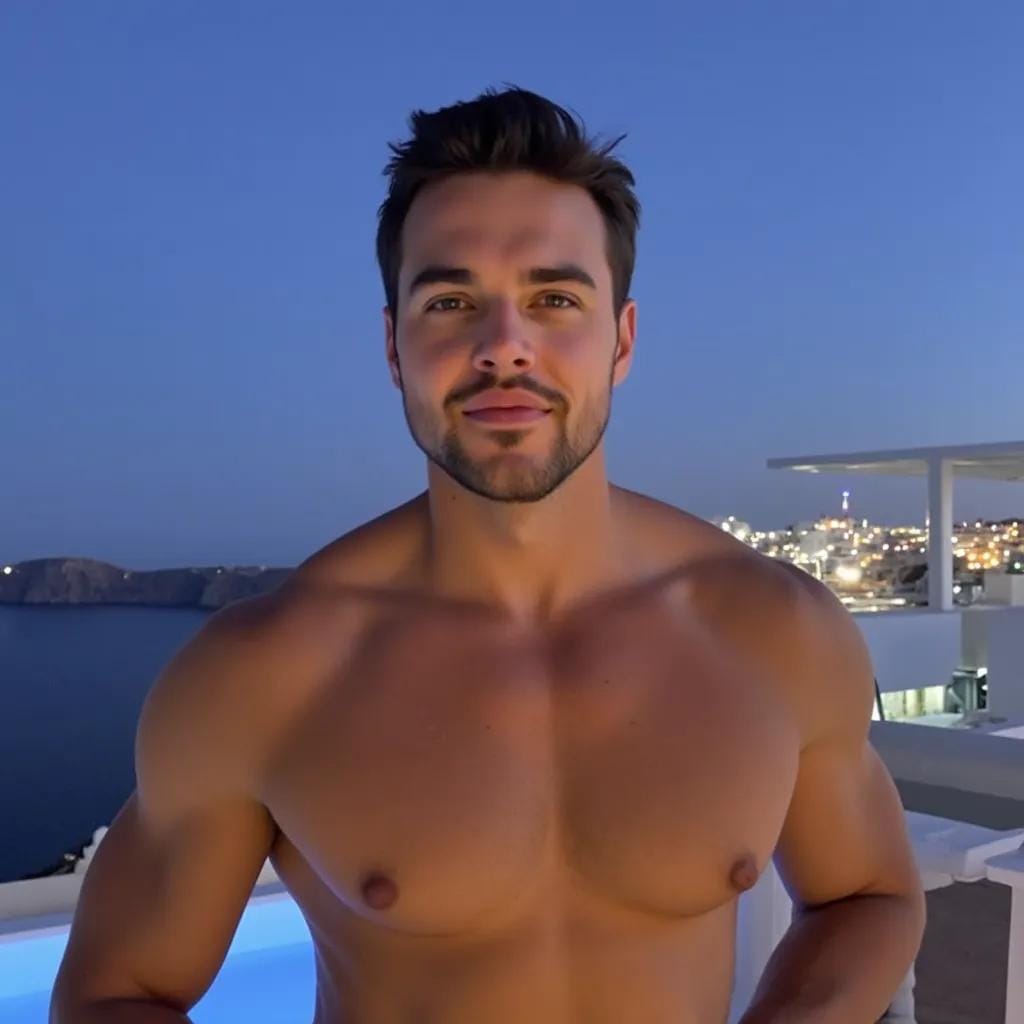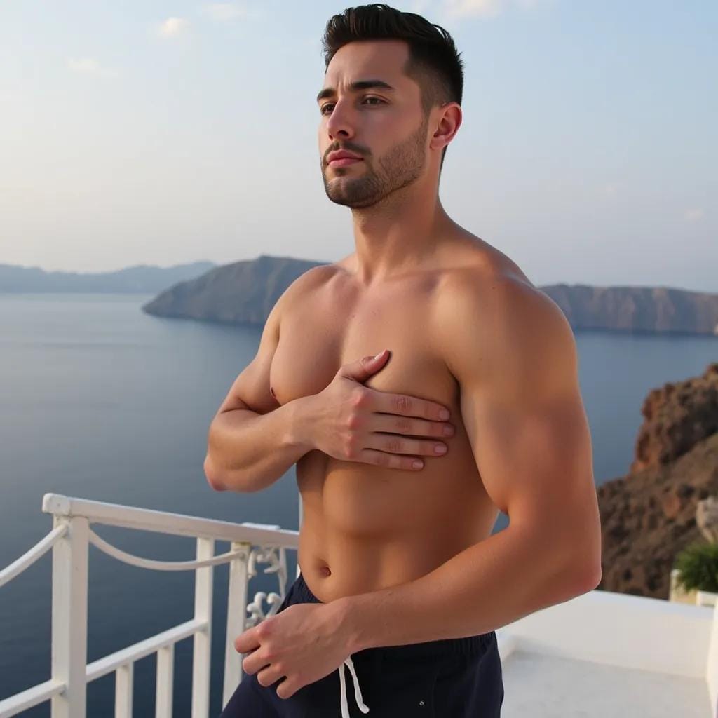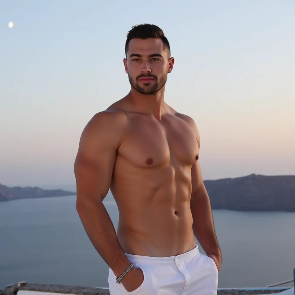 The moon cast a silver glow over the deserted rooftop terrace of a luxurious villa in Santorini, Greece. The air was heavy with the scent of blooming jasmine and the soft lapping of the Aegean Sea against the rocks below. Alexander stood at the edge, his broad shoulders silhouetted against the sky.
