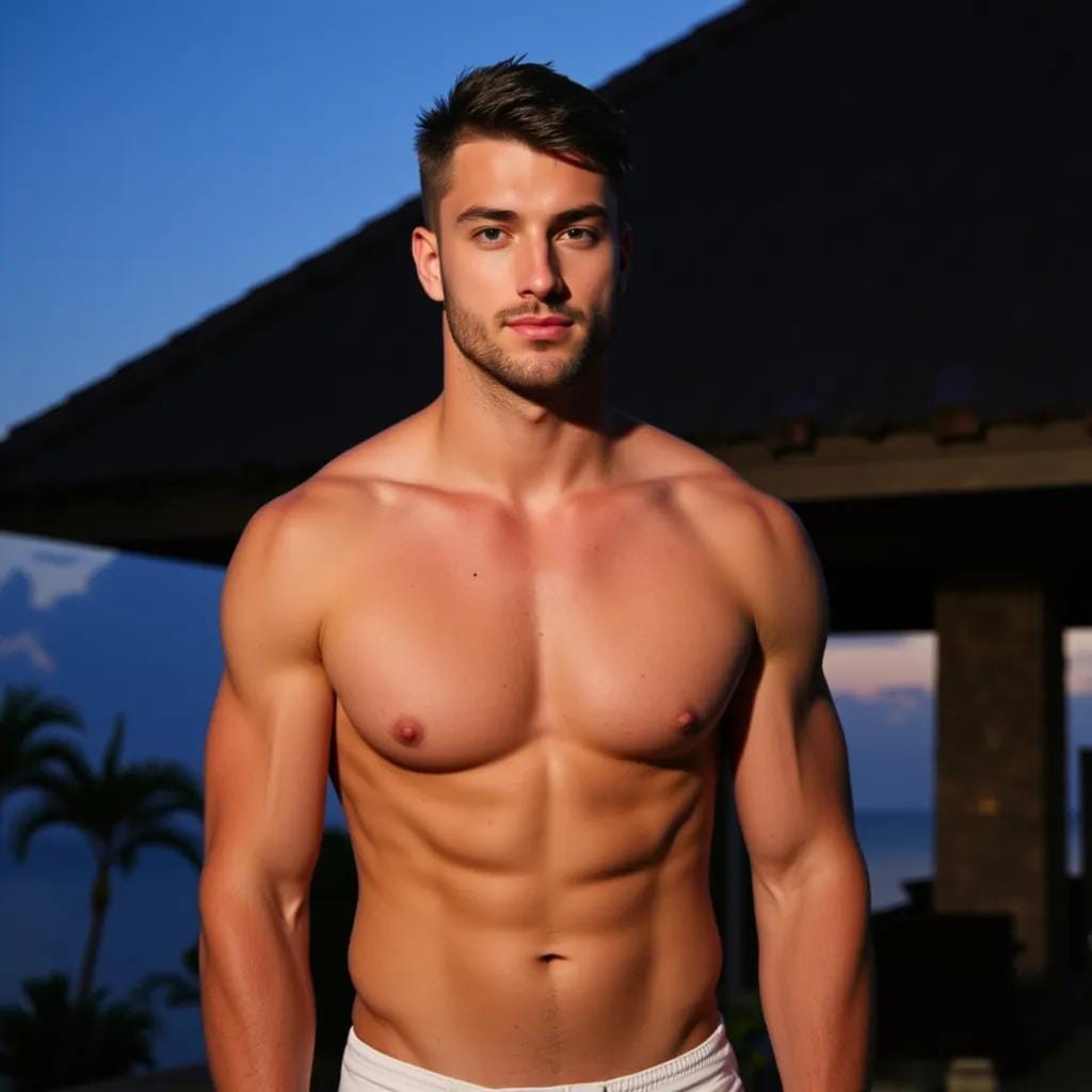 In the sultry twilight of a Balinese beachside villa, where frangipani trees swayed in the breeze and the scent of jasmine wafted through the air, Alexander stood poised, his chiseled physique a testament to the grueling hours he spent honing his physique at the local gym. His rugged jawline, accentuated by a day's worth of stubble, seemed chiseled from the very marble of the gods.