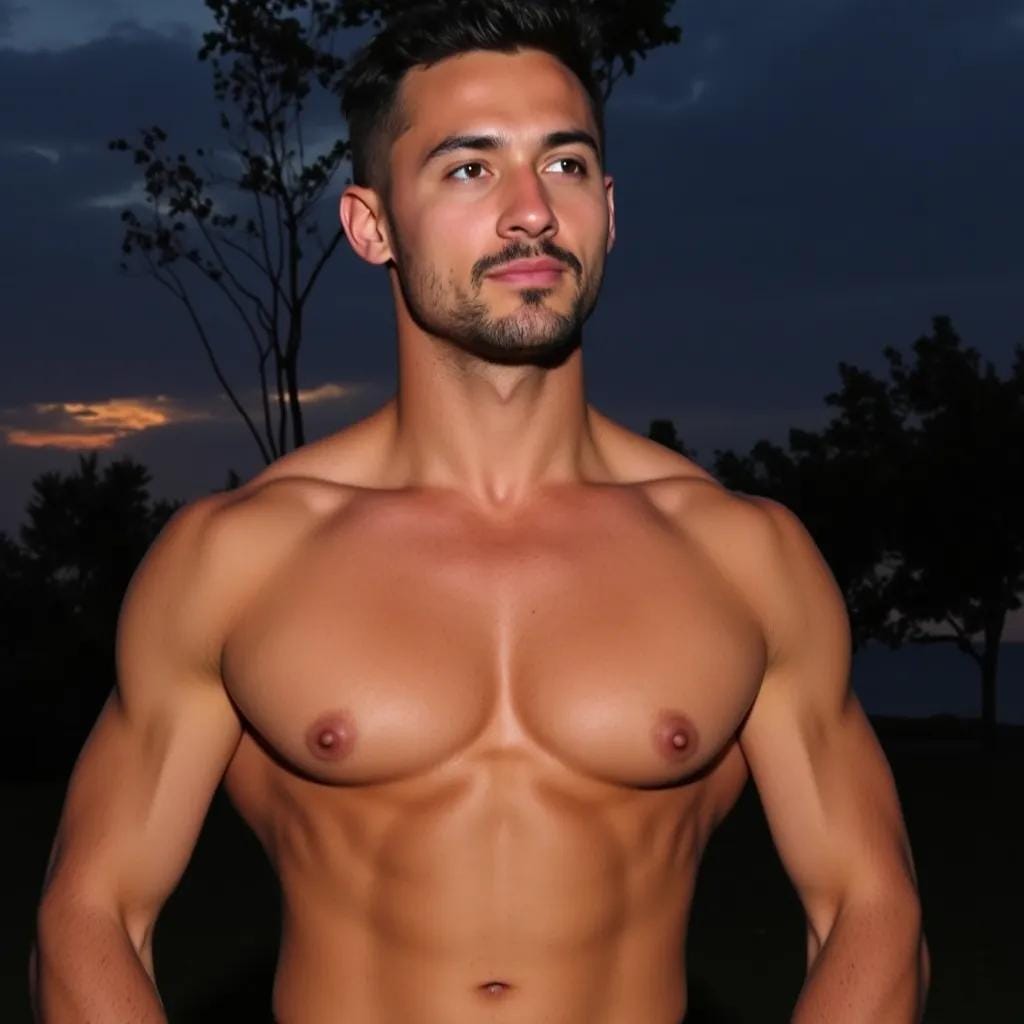 As he stood there, the setting sun casting a golden glow upon his bronzed skin, I couldn't help but feel my lips moving in silent reverence. The air was heavy with anticipation as I stepped closer, my eyes drinking in the sight of his muscular physique, the definition of his abs a testament to his dedication to fitness.