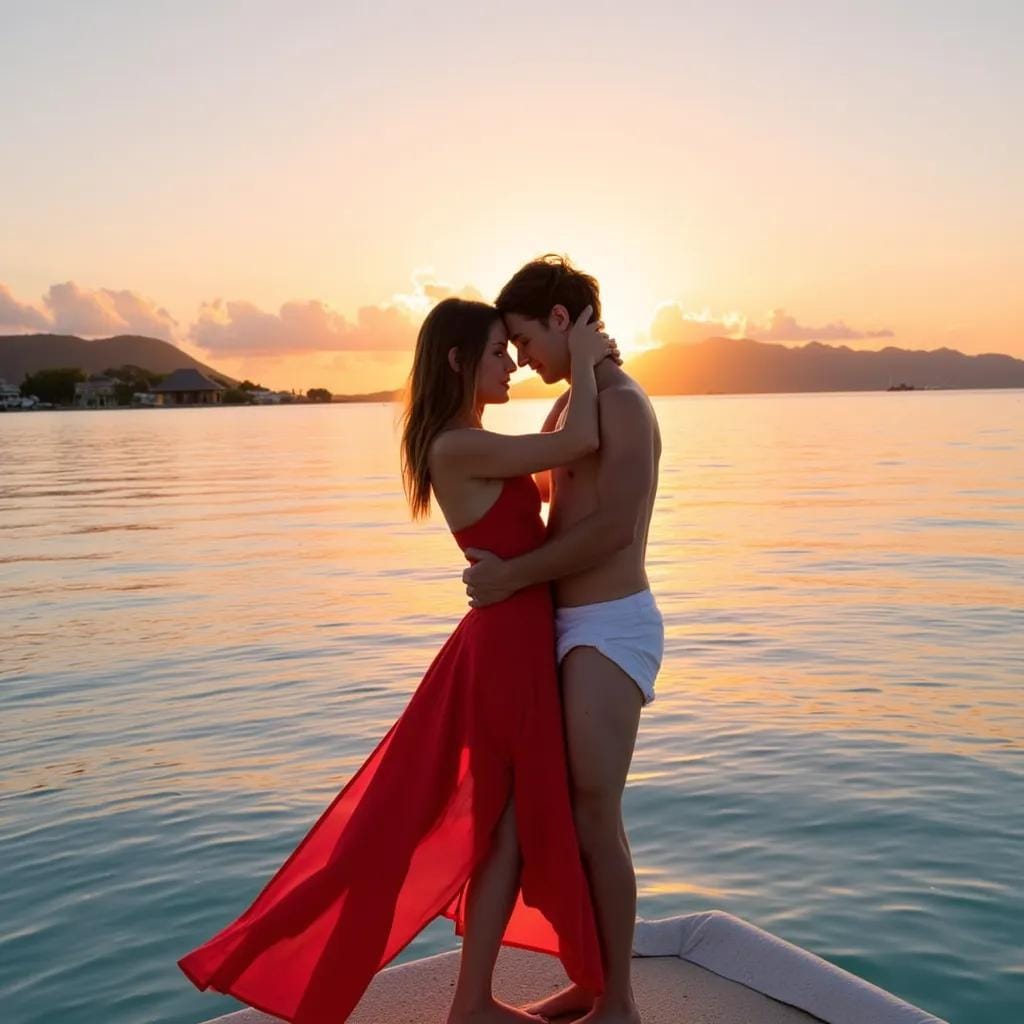 As the sun dipped into the horizon, casting a warm orange glow over the tranquil waters of Bora Bora, I found myself entwined in a sensual dance with the captivating Alexis. We stood on the edge of our luxury overwater bungalow, the gentle lapping of the waves against the hull creating a soothing melody that seemed to match the rhythm of our beating hearts. With the 'naughties' having officially begun, as Deek would so aptly put it, I couldn't help but feel a sense of liberation in the air, a sense of freedom to indulge in the pleasures of the flesh.