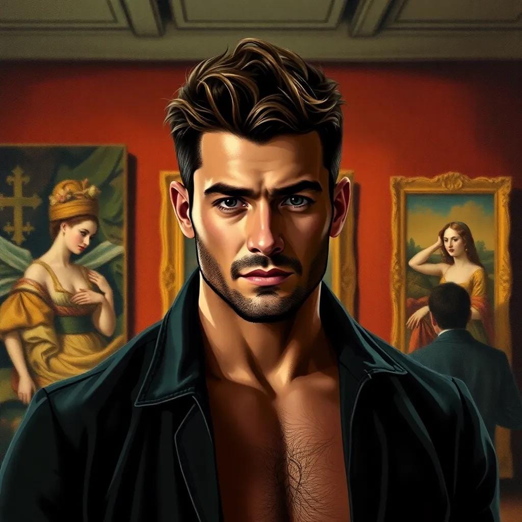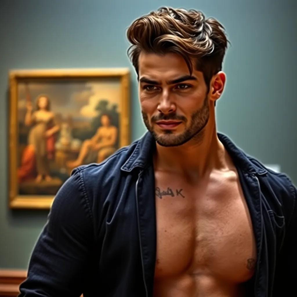 His eyes, like two sapphires, sparkled with an infectious enthusiasm as he spoke to a group of art students, regaling them with tales of the artist's inspirations and the hidden meanings behind the brushstrokes. Amidst the crowd, a young woman with porcelain skin and raven tresses, stood transfixed by the beauty of the artwork. Her eyes, like two pools of night sky, shone bright with a deep understanding of the artist's intent. As she listened to the salesman's words, a spark of recognition ignited within her, and she felt an inexplicable connection to the man speaking. As the crowd dispersed, the Fuller bust man turned to her, and their eyes met in a moment of perfect synchrony.