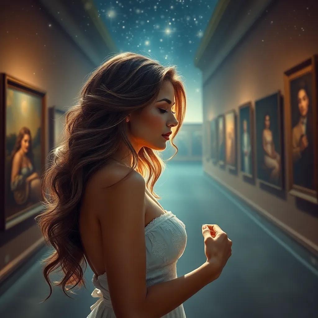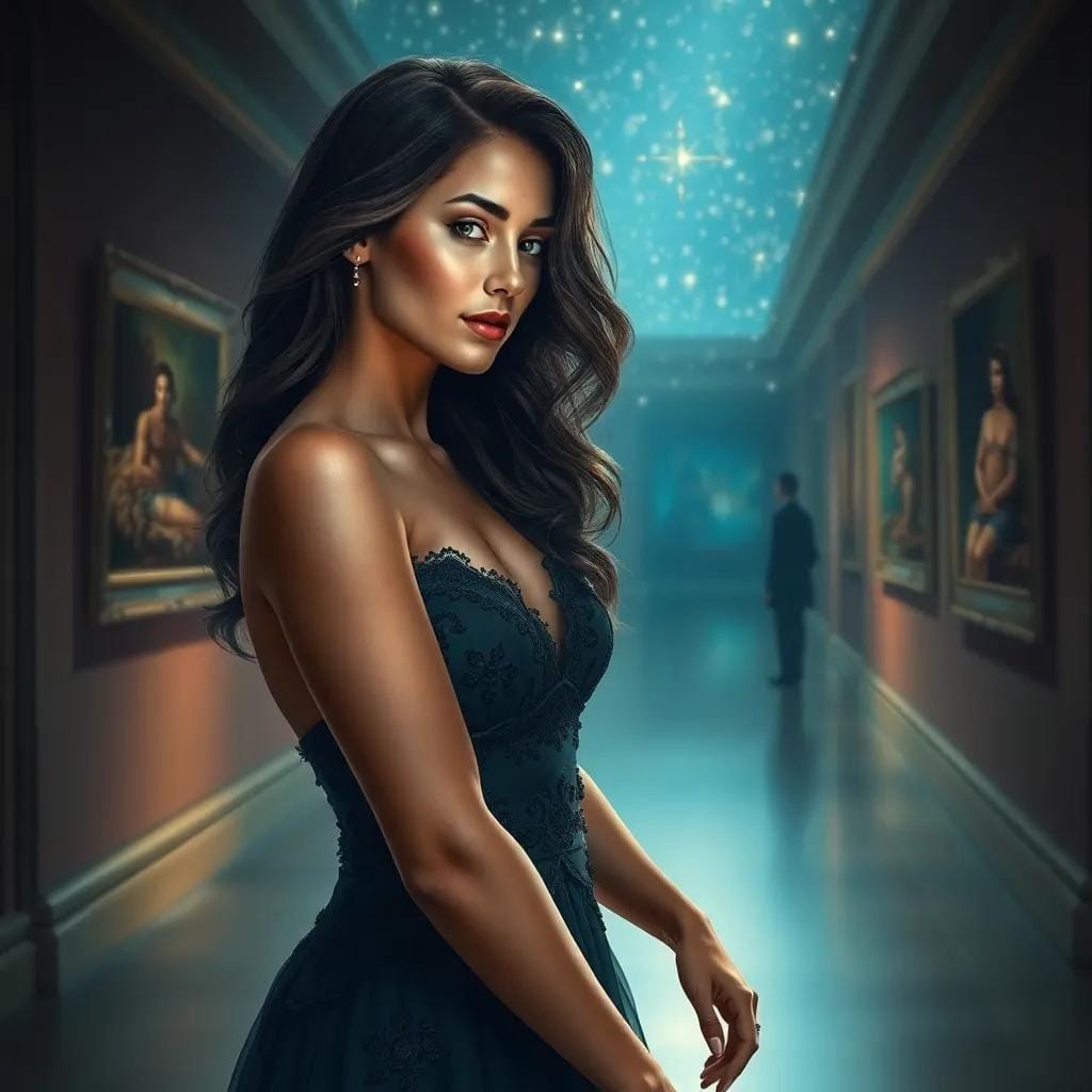 In the softly lit corridors of the art gallery, where masterpieces whispered secrets to the wind, Emma found herself entranced by a stranger's presence. His tall frame towered above the crowd, a stark contrast to the delicate beauty surrounding him.