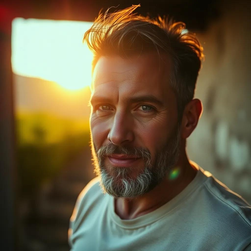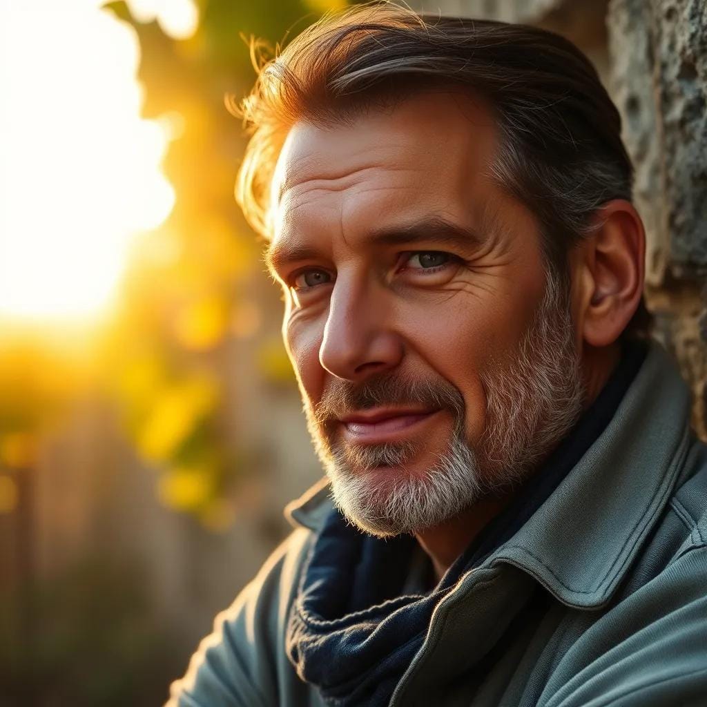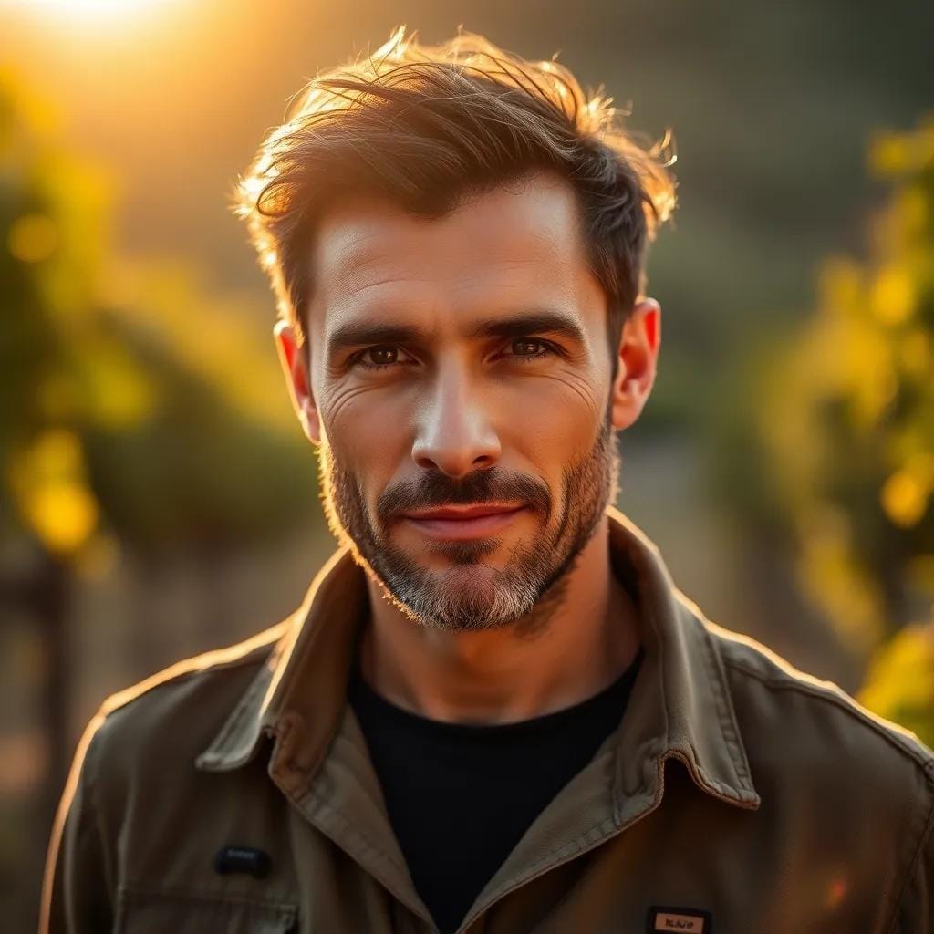 His strong jawline, accentuated by a day's worth of stubble, seemed to stand tall against the gentle breeze that rustled the leaves of the nearby olive trees. As he stood before me, his athletic physique a testament to his unyielding work ethic, I felt a sense of admiration wash over me. His skin, kissed by the golden sun, seemed to glow with a warm, earthy light.