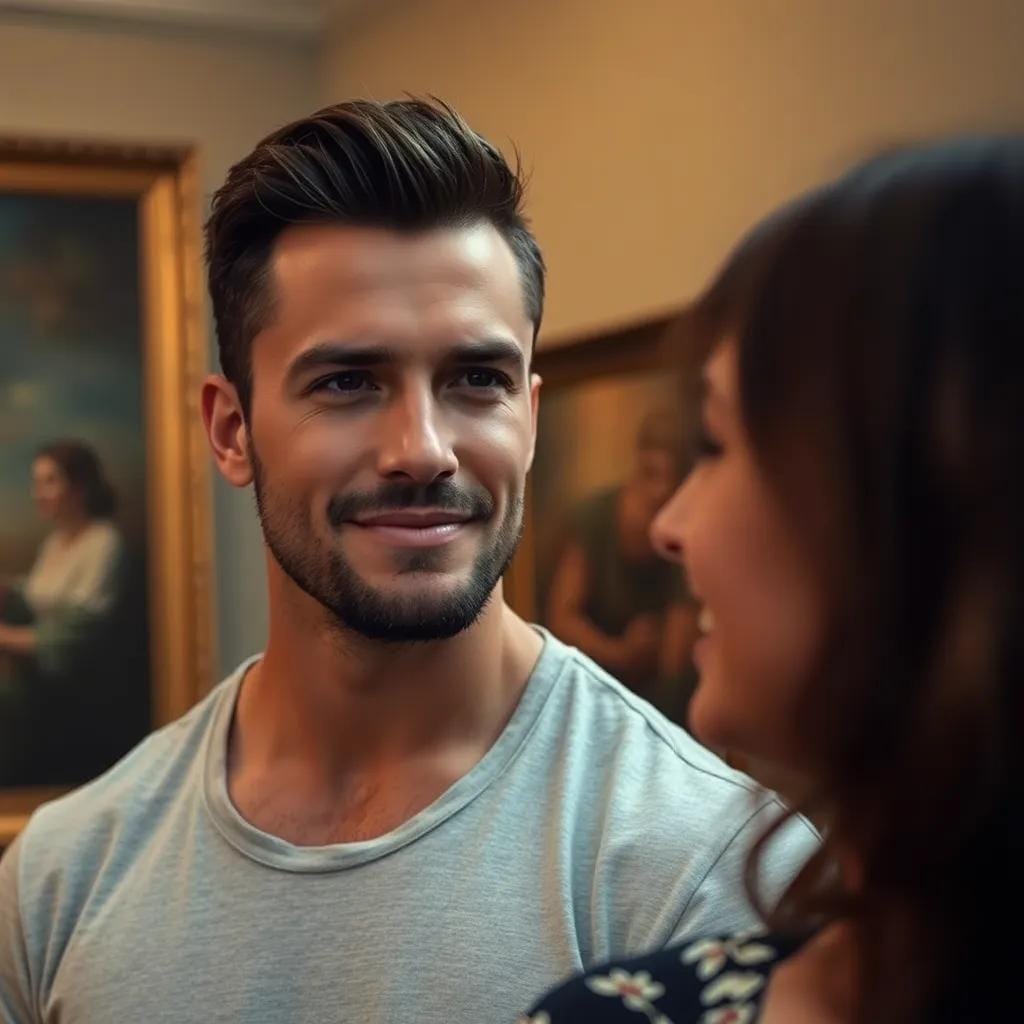 In the rarefied atmosphere of the city's oldest art gallery, where the scent of aged canvas and oil paint wafted through the air, Emily and Ryan found themselves lost in conversation. The evening sunlight streaming through the skylight above cast a warm glow on the walls, illuminating the masterpieces on display.
