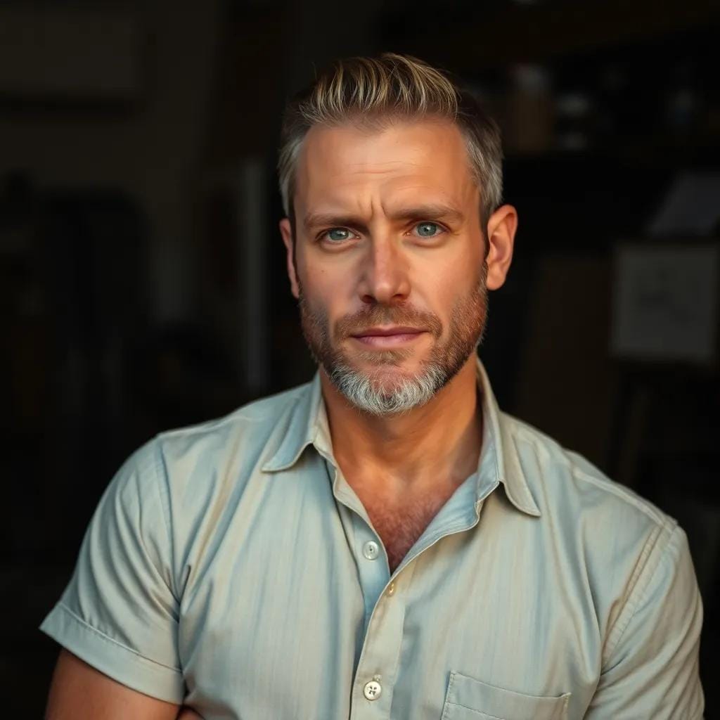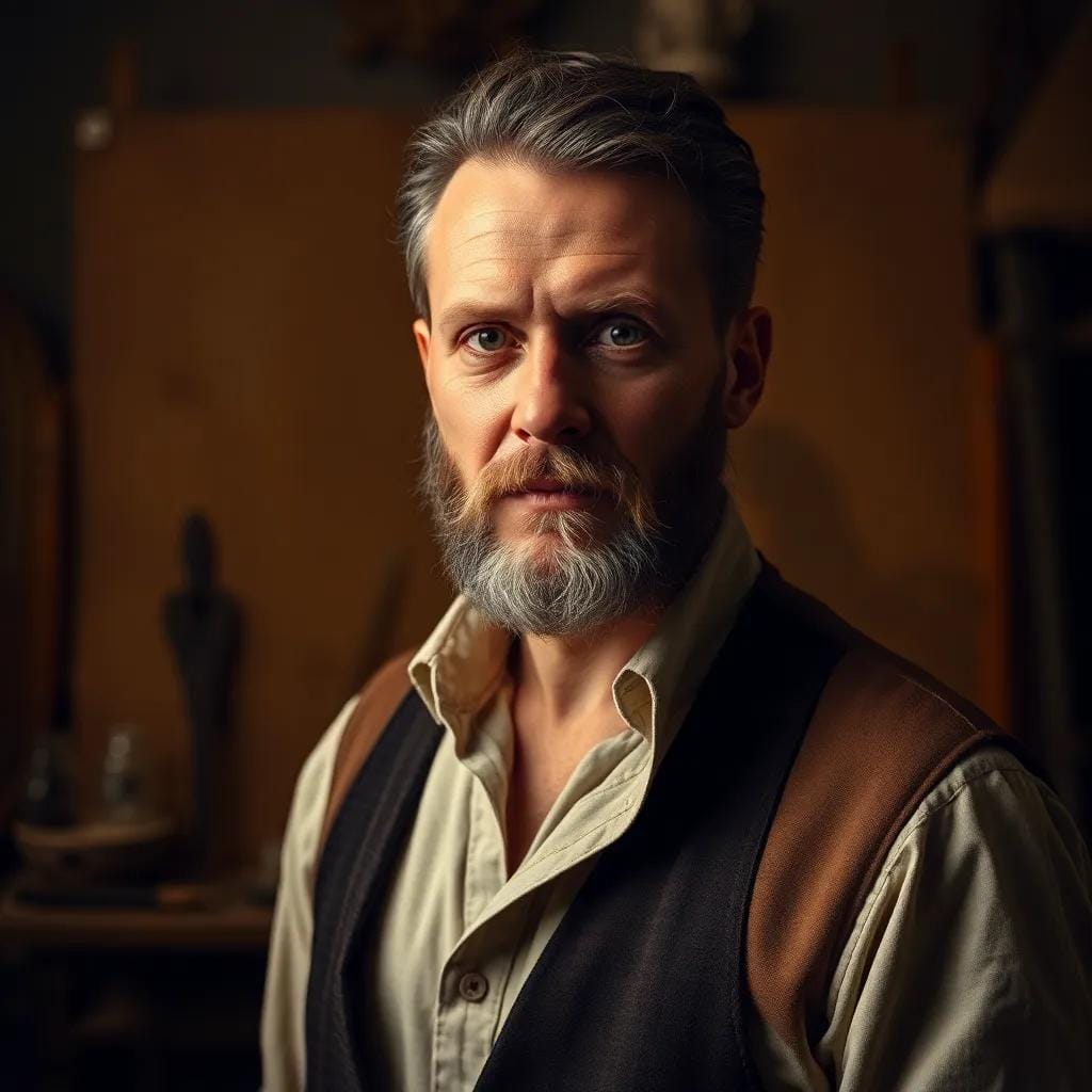 The air was heavy with anticipation as I stepped into the dimly lit studio, the scent of turpentine and linseed oil wafting through the air. Before me stood the master of his craft, his chiseled features illuminated by the soft glow of the studio lights.