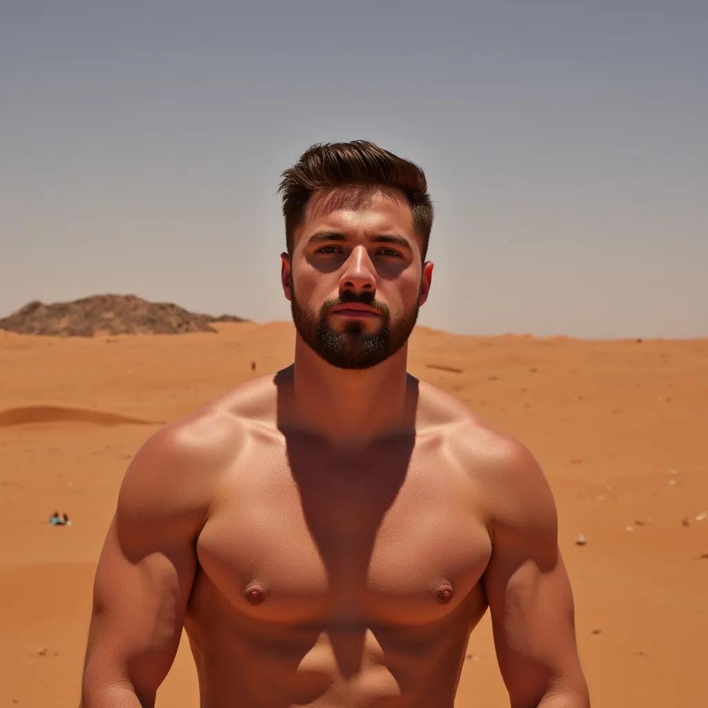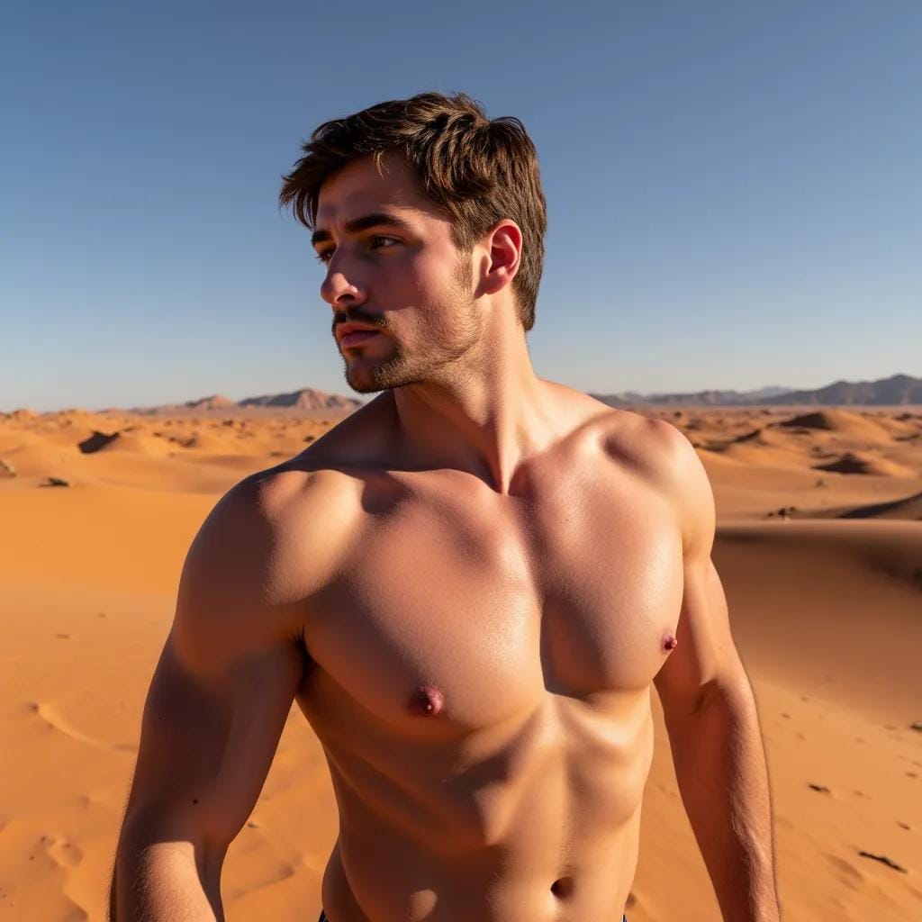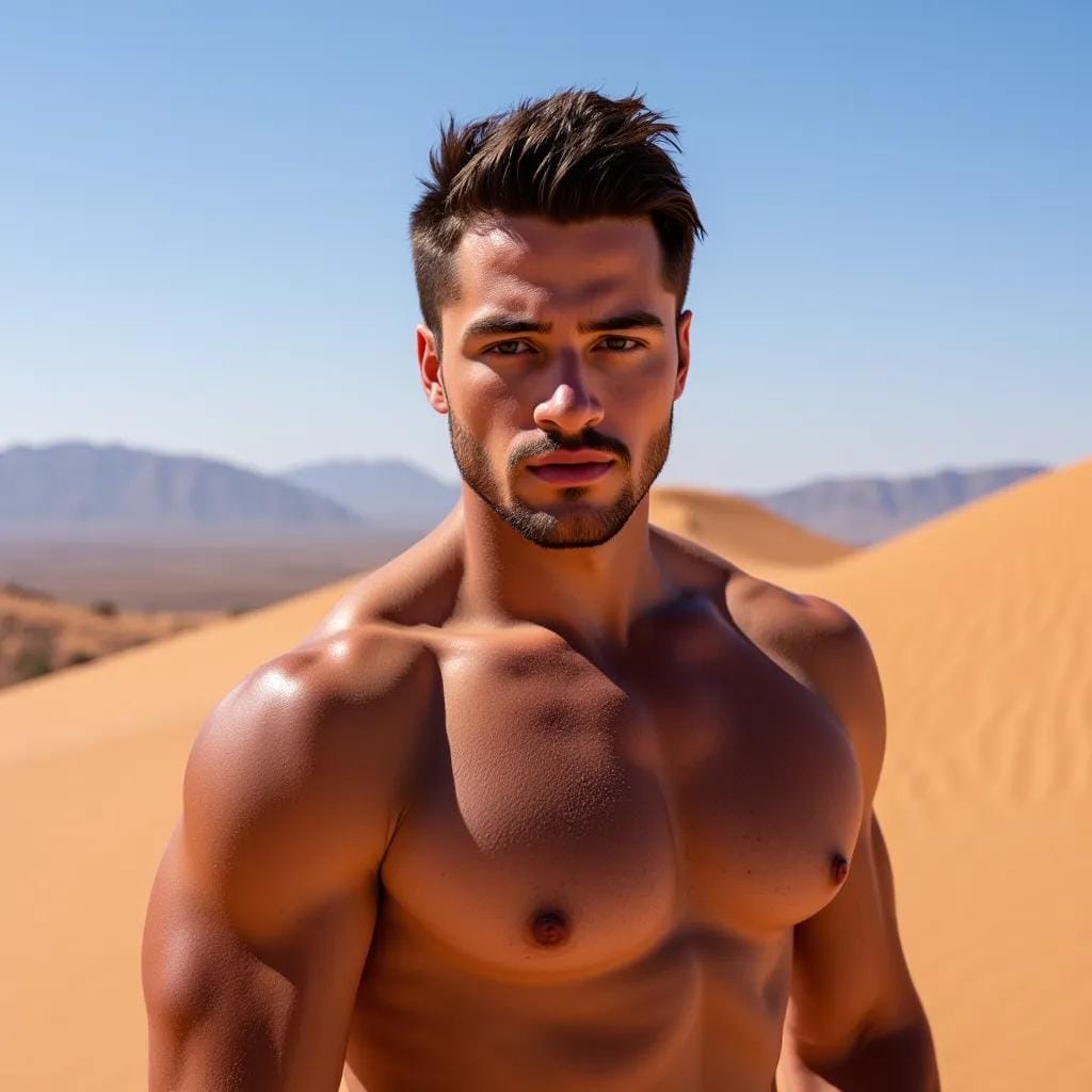 It was here, in this desolate yet breathtaking landscape, that I first laid eyes on him - a god among men, with a physique chiseled from the very stone that surrounded us. His name was Khalid, a Bedouin warrior with skin as dark as the night sky and eyes that burned like the desert sun. His rugged features were etched with the lines of a thousand battles, yet his smile could light up the darkness like a beacon of hope.
