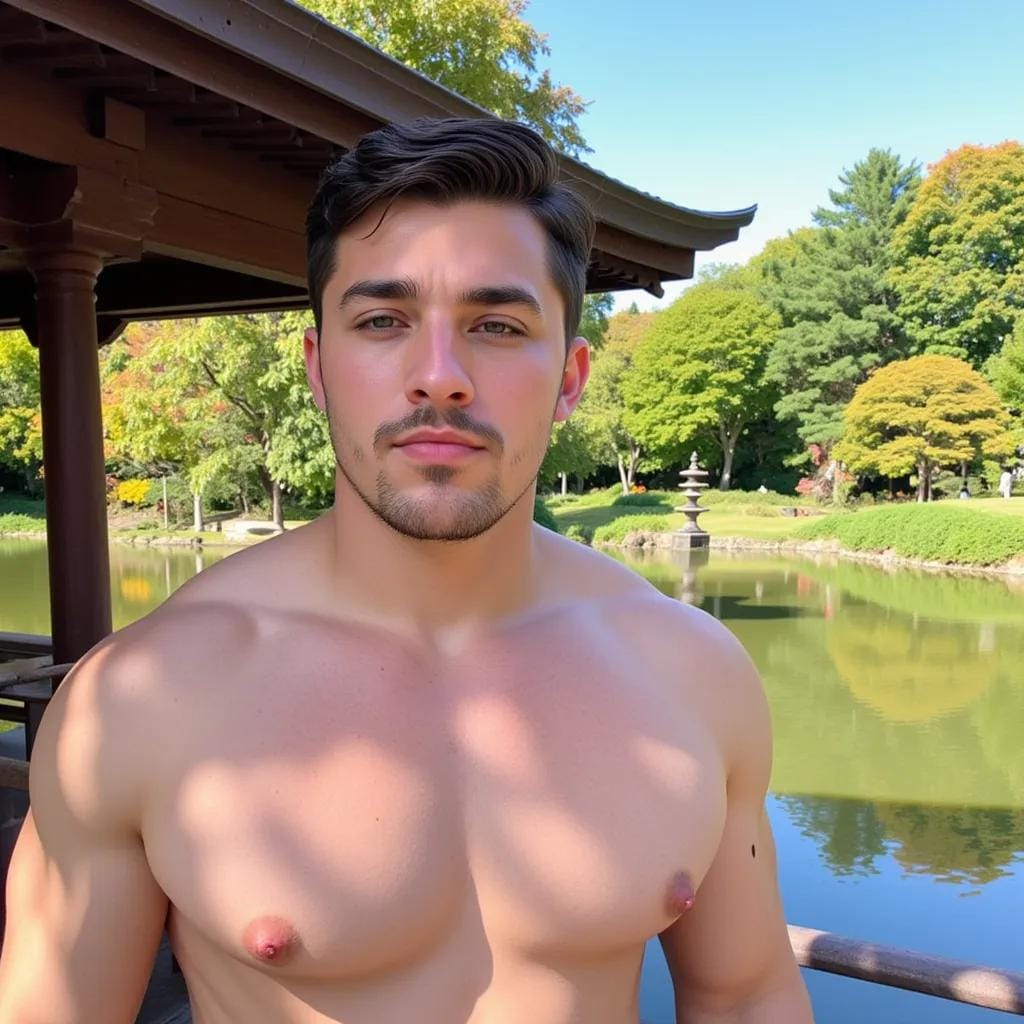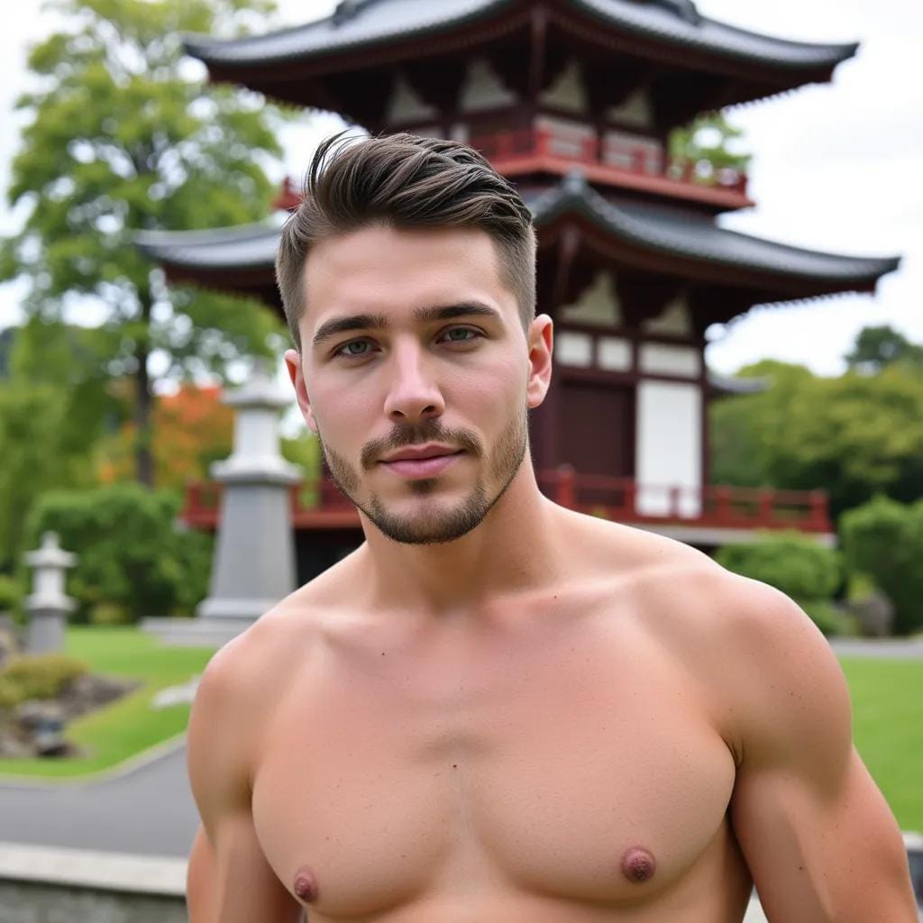 As I stood before the serene beauty of the Japanese temple, the soft rustle of the silk kimono against my skin seemed to whisper sweet nothings in my ear. My eyes, fixed upon the chiseled features of the deity before me, were drawn inexorably to the rugged line of his jaw, the sharp planes of his cheekbones, and the full, sensual curve of his lips. "Uh...
