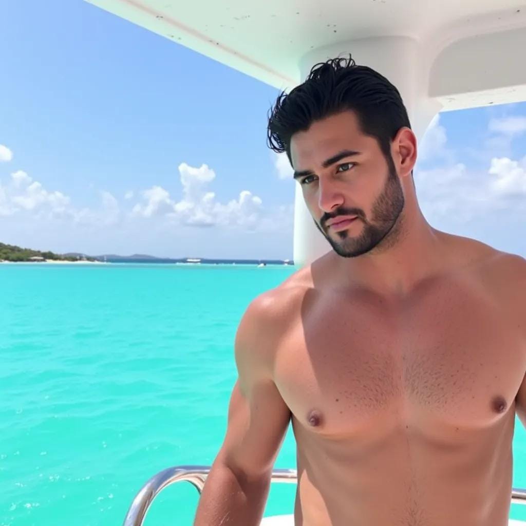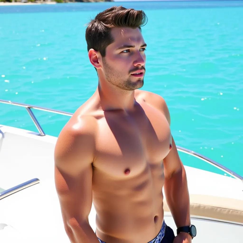 "Island Oasis" Kai, a ruggedly handsome entrepreneur, stood on the sun-kissed deck of his sleek, white yacht, gazing out at the turquoise waters of the Caribbean. His chiseled features were set in a contemplative expression, his piercing blue eyes lost in thought.