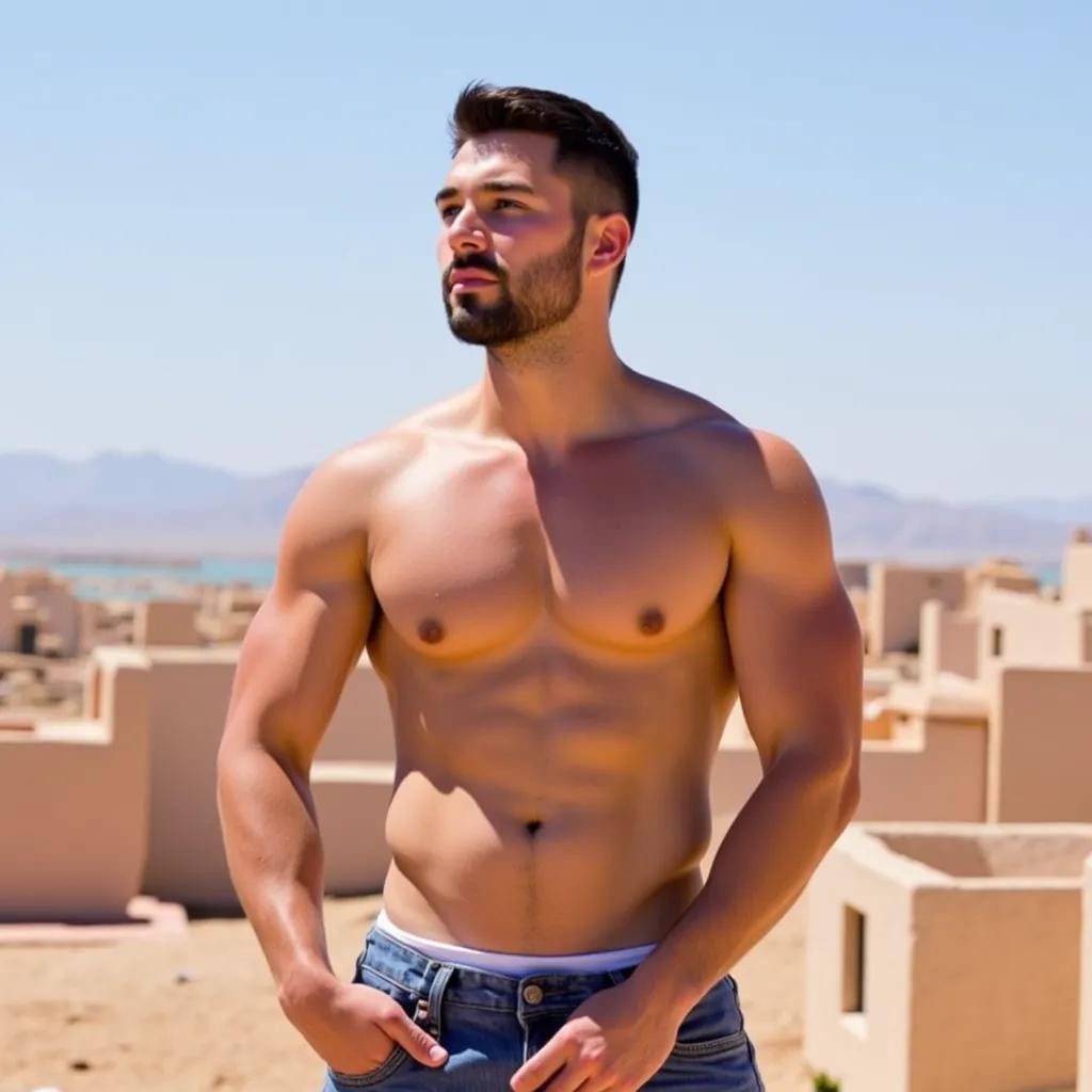 He was a vision of masculine perfection, and I felt my heart skip a beat as our gazes met. Without a word, he beckoned me over, and I found myself drawn to him like a moth to flame. We stood together, the warm breeze rustling our hair, and I felt his eyes burning into my skin.