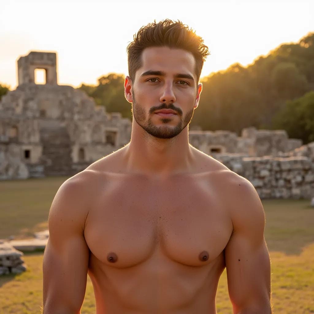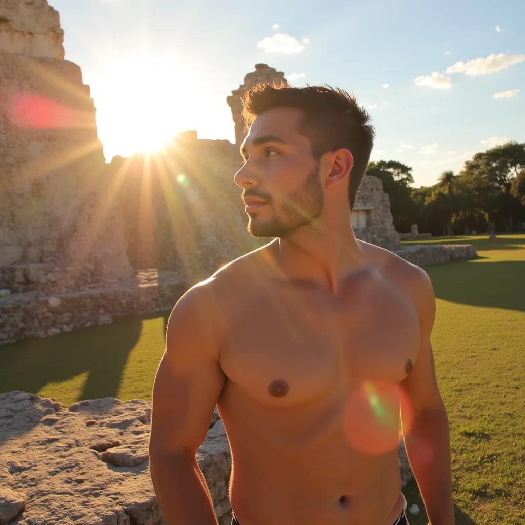 The scorching sun beat down upon the cracked earth of the ancient Mayan ruins, casting a golden glow over the crumbling structures. It was here, amidst the whispers of a forgotten civilization, that I found myself entwined with the enigmatic and ravishingly handsome, Alejandro. His eyes, like two dark pools of obsidian, seemed to draw me in with an otherworldly allure.
