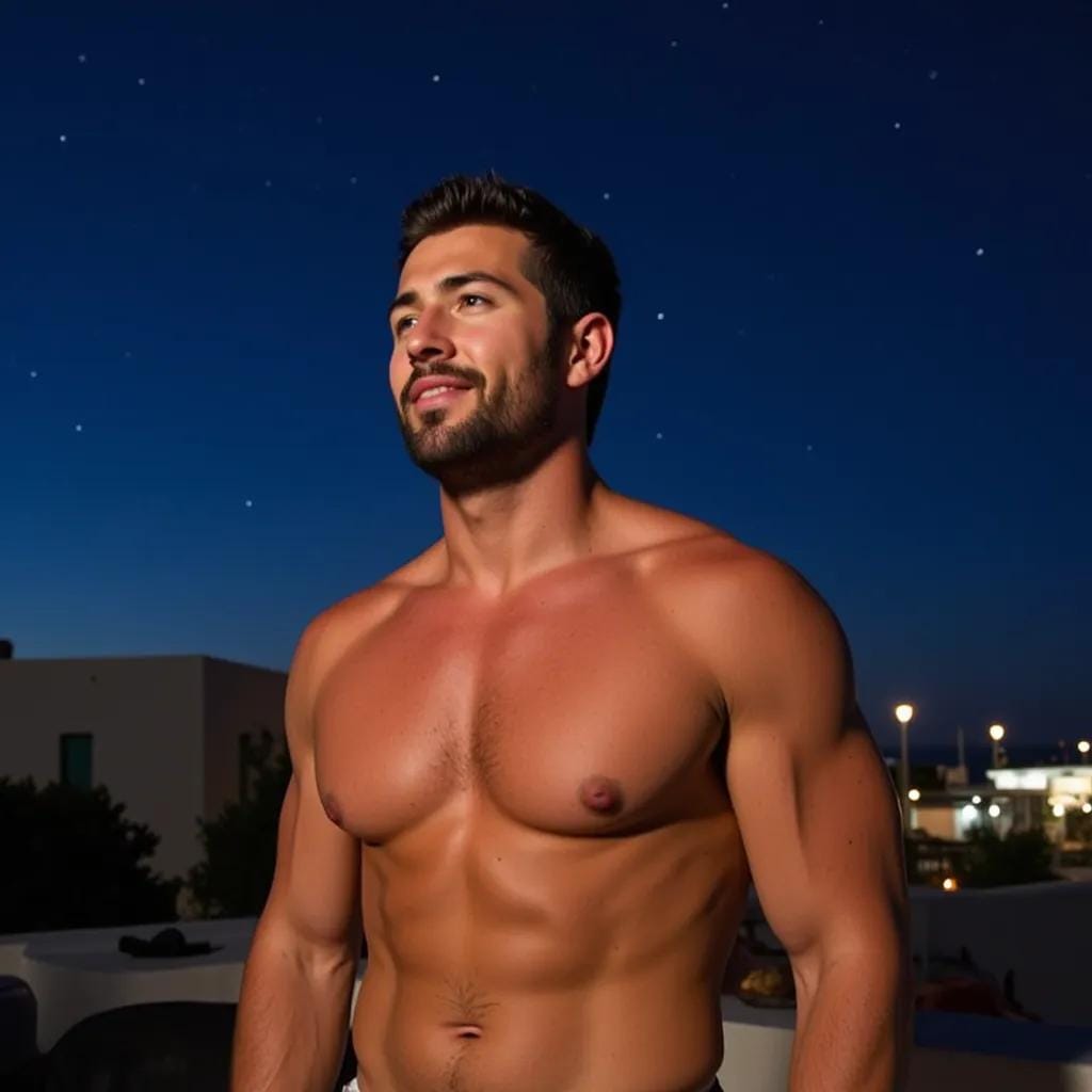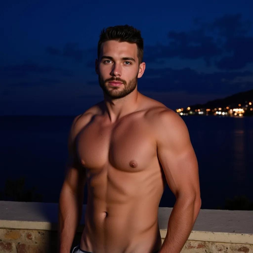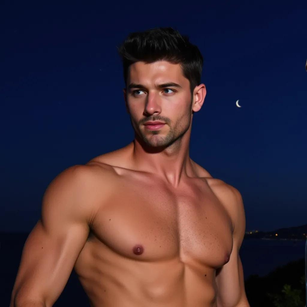 The warm breeze rustled his dark hair, and the scent of jasmine wafted through the air, transporting him to a bygone era of elegance and refinement. Below him, the villa's gardens were alive with the soft glow of lanterns, casting a magical ambiance over the lush greenery. Marcus's eyes drifted to the figure standing by the pool, a vision of masculinity in a tailored white suit, his chiseled features illuminated by the soft light. That was when he saw him – Alessandro, the villa's owner, with his strong jawline and piercing blue eyes. Their gazes met, and Marcus felt a spark of electricity run through his veins. He descended the stairs, his heart pounding in his chest, as Alessandro's eyes never left his face. As he approached, Alessandro's smile grew, and he extended a hand, drawing Marcus into a warm, sensual embrace.