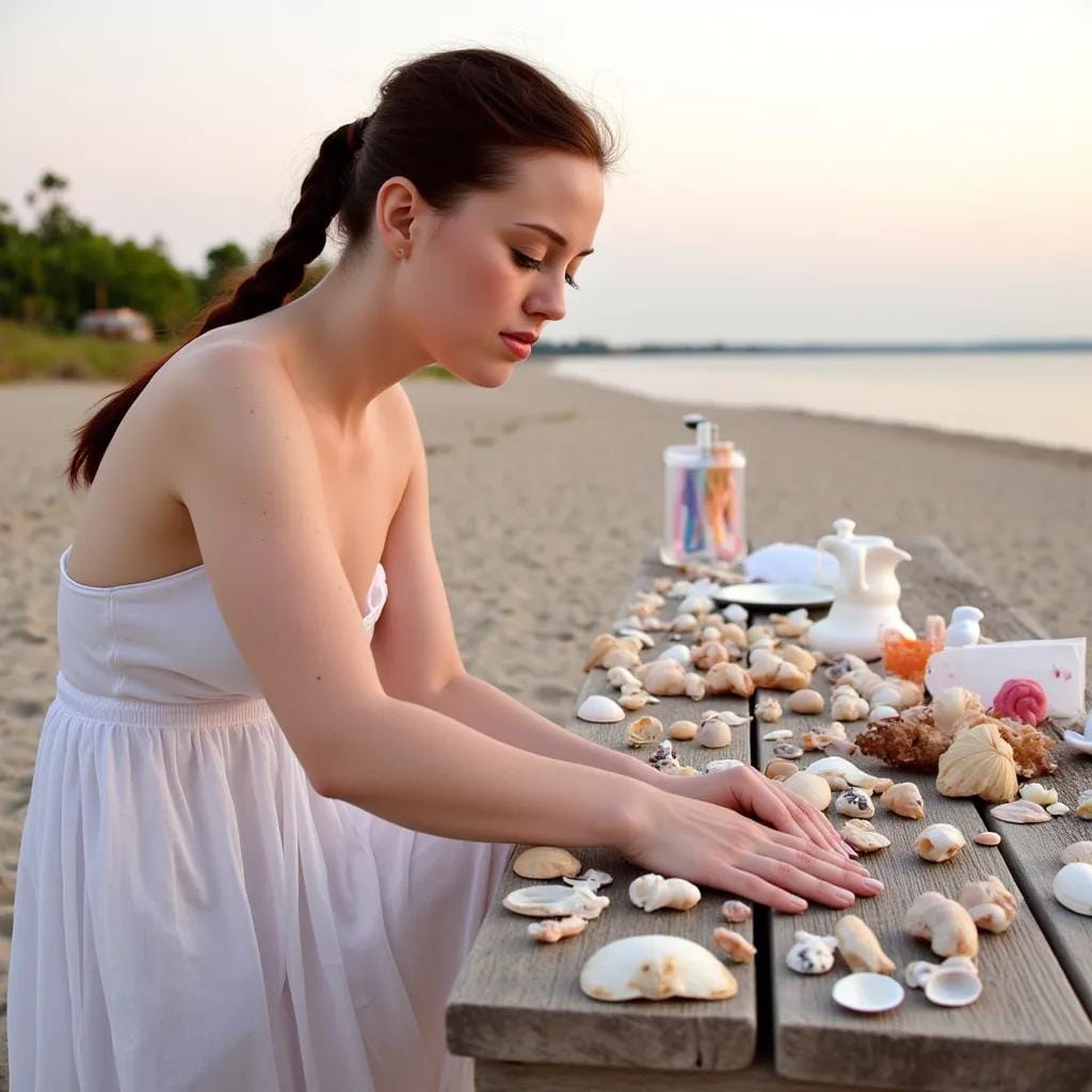 She sold seashells by the shore, her porcelain skin glistening with dew as she carefully arranged her wares on the weathered wooden table. The scent of saltwater and coconut wafted through the air, enticing passersby to linger and admire the delicate treasures.