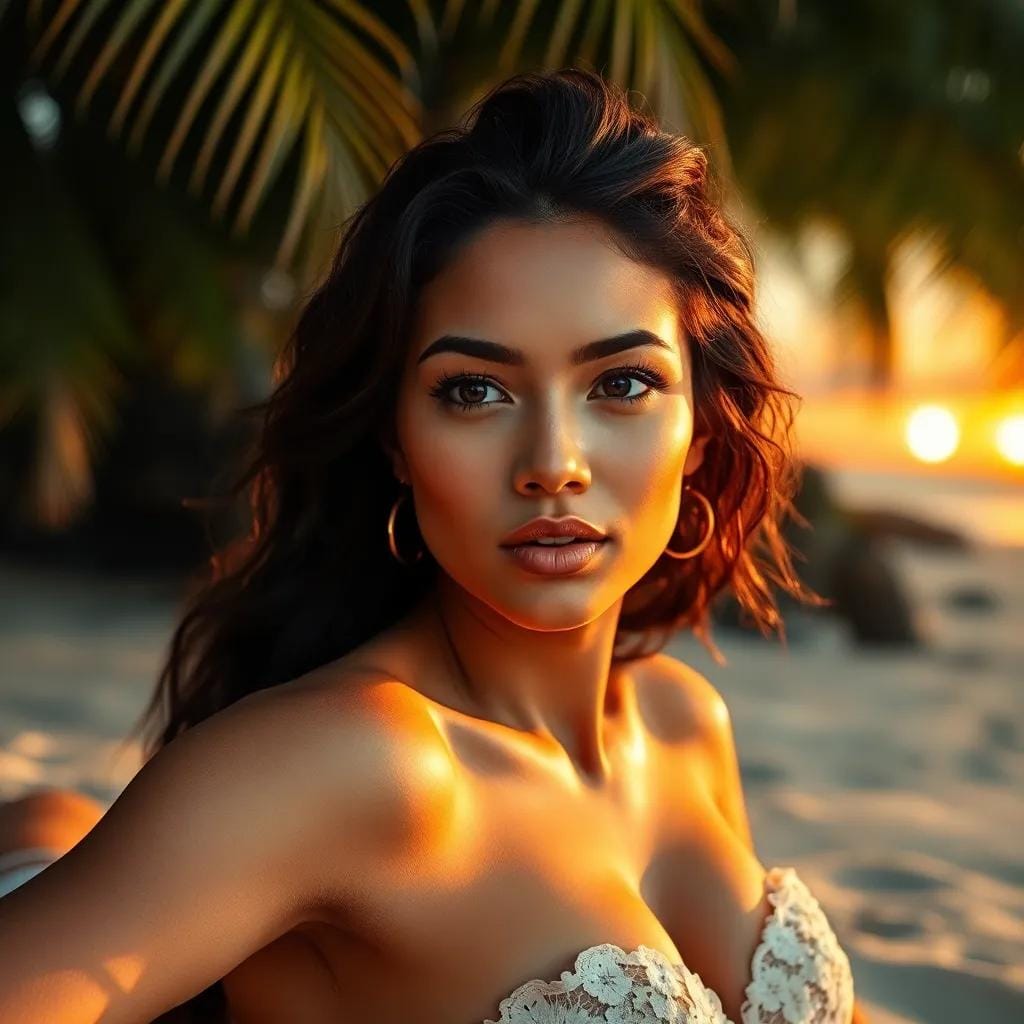 As the tropical sunset cast its warm, golden glow upon the sandy shores, I couldn't help but be entranced by the beauty that lay before me. My gaze was drawn to her, a vision of loveliness, with skin as radiant as alabaster and hair as dark as the night sky.