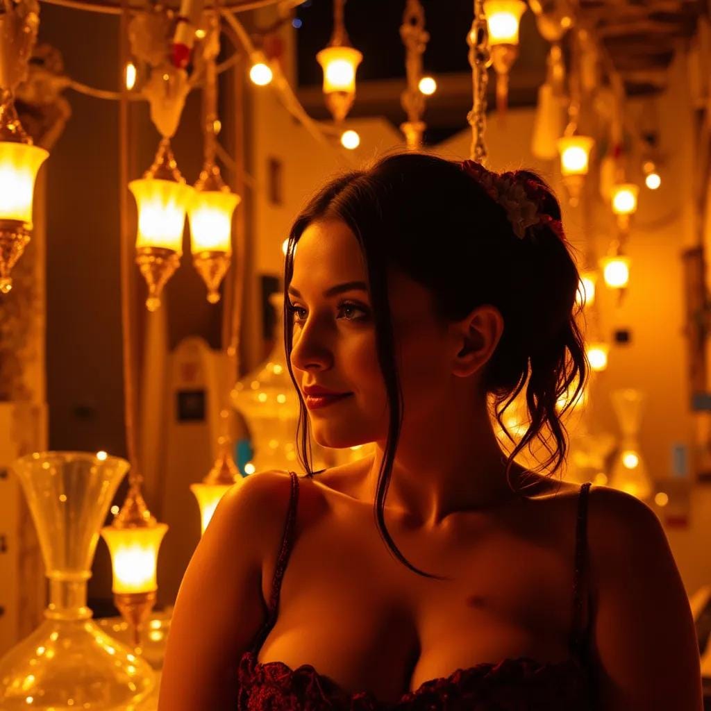 Her skin, a canvas of warm, golden hues, seemed to shimmer in the flickering light, as if infused with an inner radiance. As we navigated the winding alleys, the scent of exotic spices and incense wafted through the air, intoxicating us both.