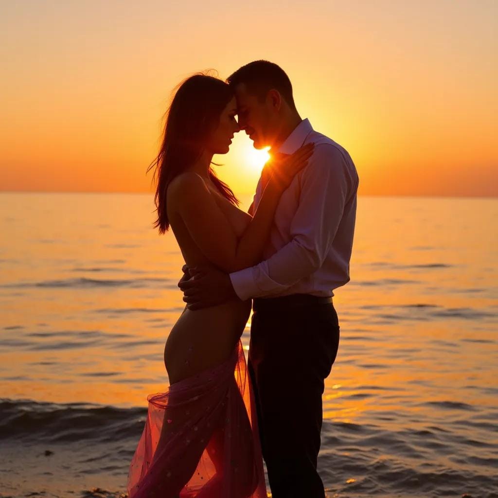 The world around us melted away, leaving only the two of us, lost in the moment. As the sun dipped below the horizon, casting the sky in a warm orange glow, I knew that this was just the beginning of a night I would never forget. We spent the evening lost in each other's arms, our bodies entwined in a sensual dance.