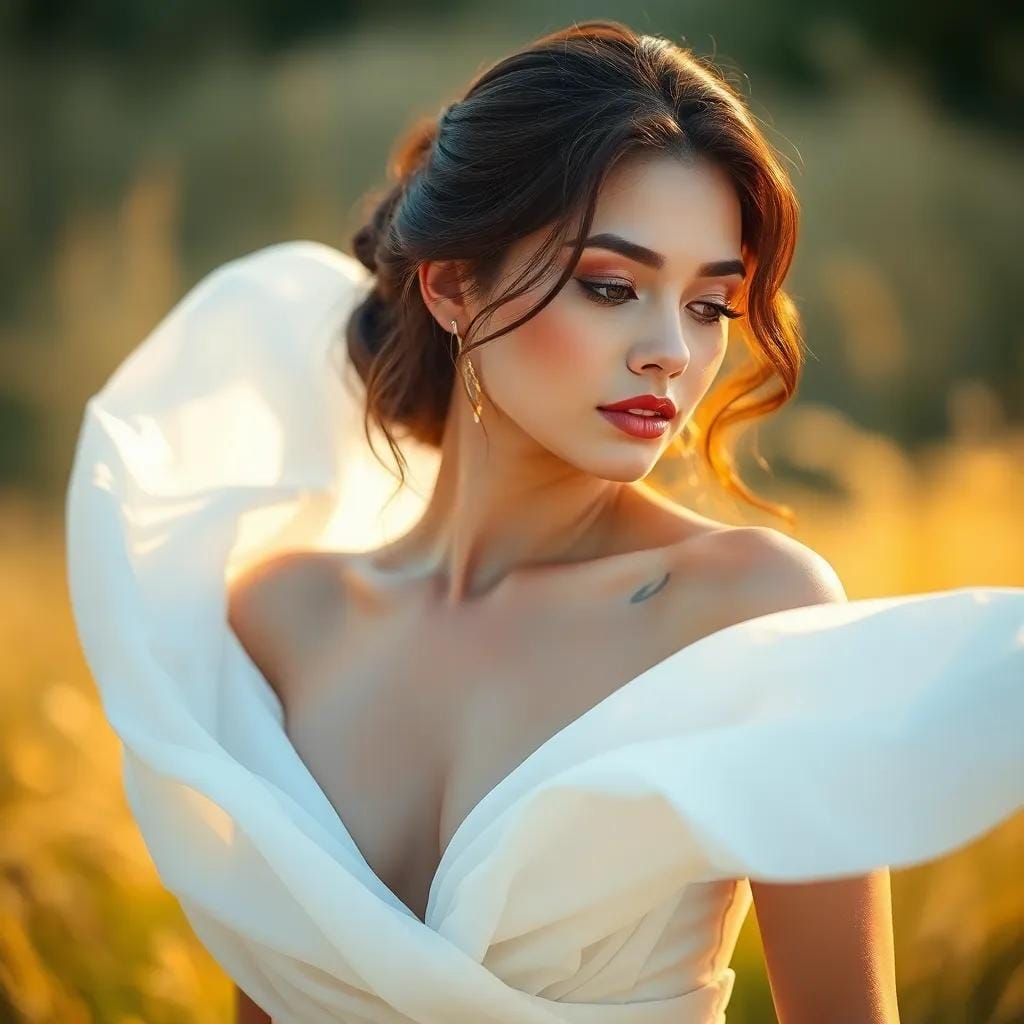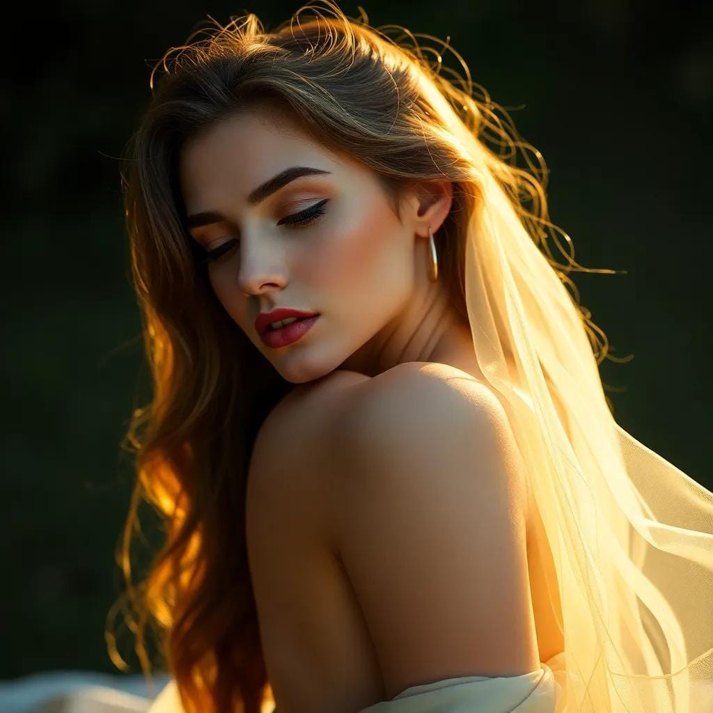In the soft, golden light of a summer's eve, a breathtaking beauty named Luna unfolded like a blooming flower, her elegant curves unfolding with each languid stretch. Her skin, a canvas of alabaster and rose petal, seemed to radiate a warm, ethereal glow as she posed for the artist's brush. The air was filled with the sweet scent of jasmine and the gentle rustle of leaves as Luna's fingers danced across the strings of her lyre, her music a soothing serenade that conjured visions of serene landscapes. Her eyes, pools of sapphire and mystery, locked onto the artist's, and he was captivated by their captivating charm. As the night wore on, Luna's pose became more alluring, her body a work of art in motion. The artist's brush danced across her skin, capturing the delicate touches and soft caresses that sent shivers of delight down her spine. Gentle kisses and loving glances were exchanged, their connection building like a gentle breeze. In this peaceful night, Luna's beauty was a captivating charm, a gentle call that beckoned the artist to surrender to his creativity. And as he succumbed to her elegance, he knew that he would be forever inspired by her artistic presence, his heart and soul nourished by the beauty that she embodied.