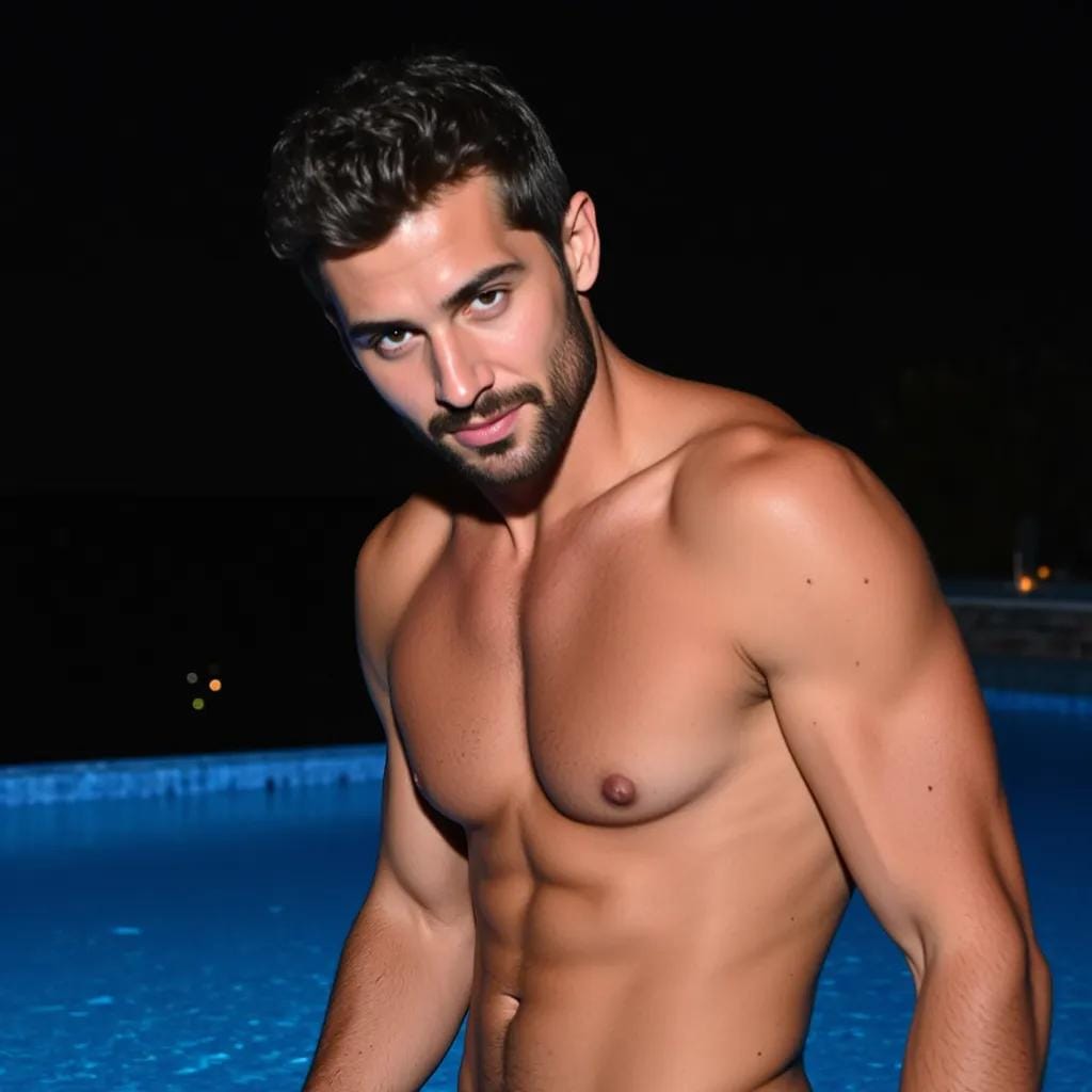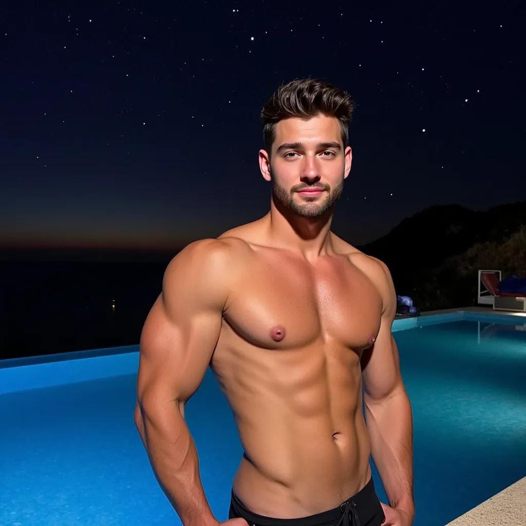The air was alive with the sweet scent of blooming jasmine, and the sound of the waves created a soothing melody that seemed to match the rhythm of my heartbeat. Before me stood the epitome of masculinity, a towering figure of strength and power. His chiseled features were illuminated by the soft glow of the pool lights, casting a golden aura around him.