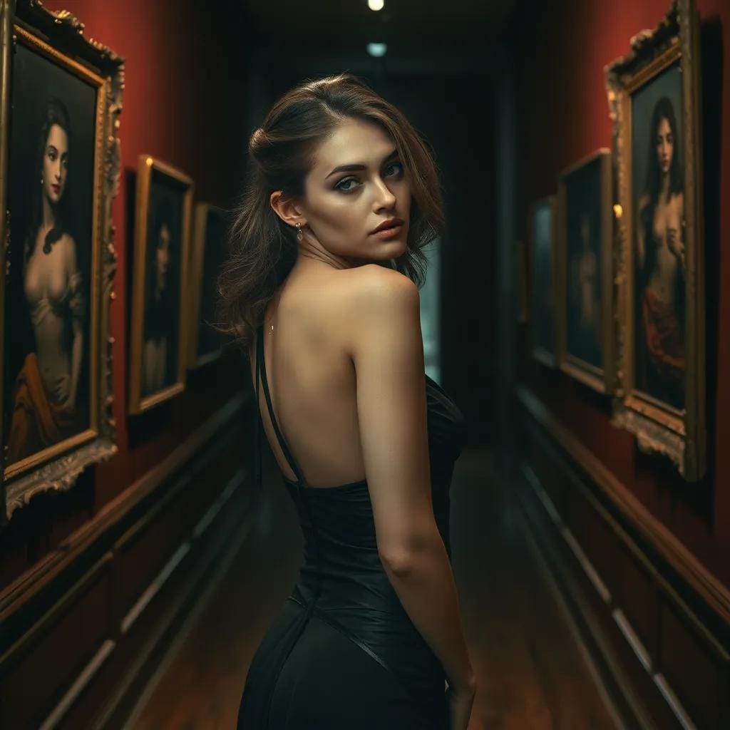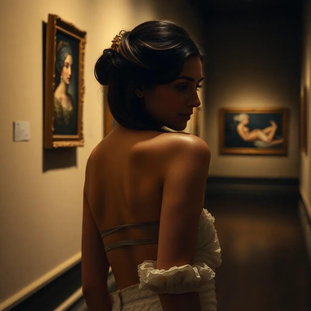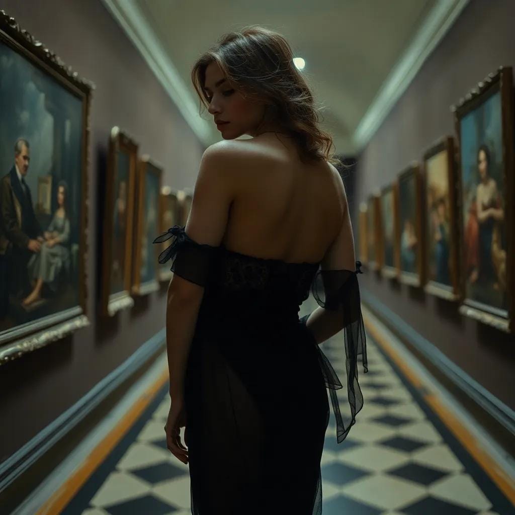 Yet, it was precisely this sense of disorientation that led me to the quiet corners of the gallery, where I would lose myself in the labyrinthine passages and discover fragments of myself amidst the masterpieces. It was on one such evening, as the sun cast its golden glow upon the gallery's tranquil courtyard, that I first saw her. She was standing before a majestic Monet, her eyes drinking in the Impressionist's soft brushstrokes like a parched traveler at an oasis. Her raven hair cascaded down her back like a waterfall of night, and her slender fingers seemed to tremble with emotion as she reached out to touch the canvas. I was captivated by the serenity that radiated from her very being, as if she were a creature from a world untouched by the chaos that swirled around us. We struck up a conversation, our words flowing like the gentle lapping of the Seine against the gallery's stone walls. We spoke of art, of life, of the fragile beauty that lay hidden beneath the surface of our mundane routines.