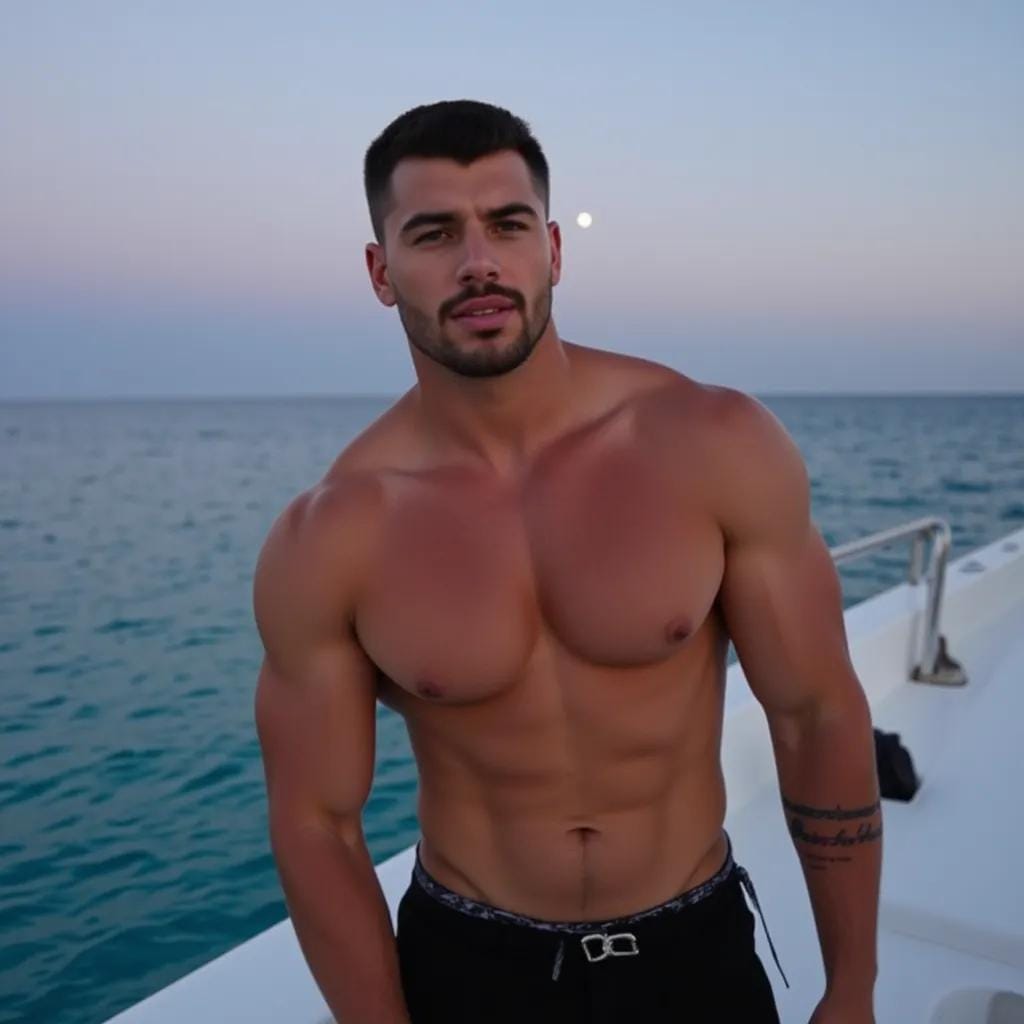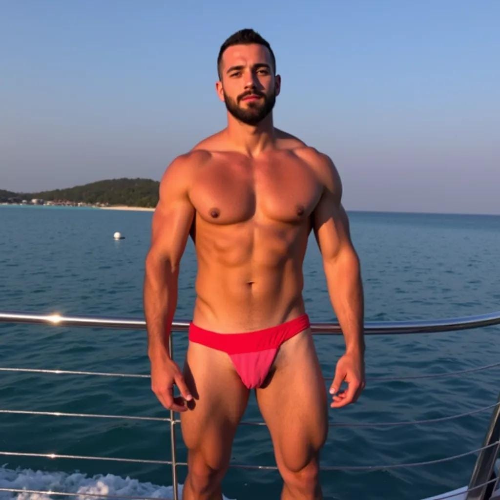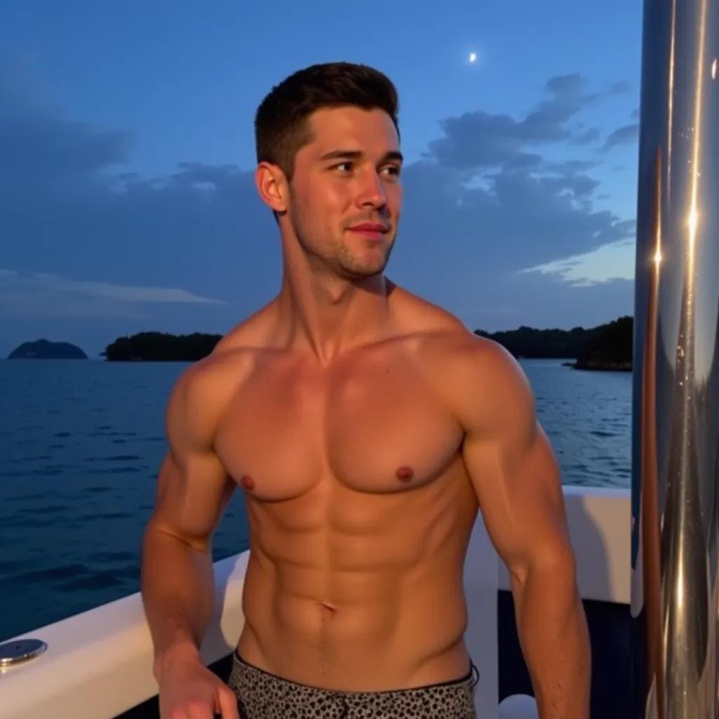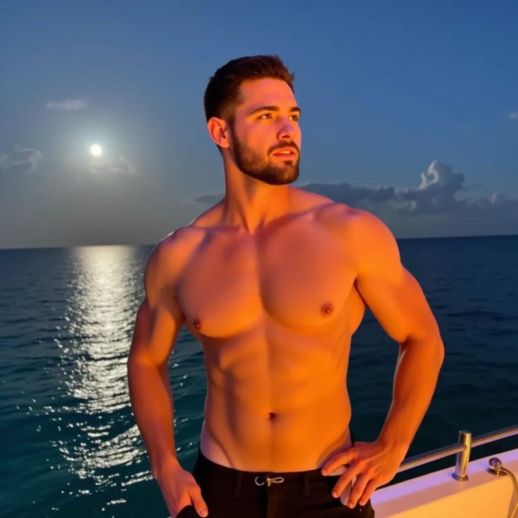 The moon cast a silver glow over the tranquil waters of the Maldives as Jack stood on the deck of his luxurious yacht, his rugged physique illuminated by the soft light. His broad shoulders and chiseled chest were a sight to behold, and his piercing blue eyes seemed to gleam with a hint of mischief as he gazed out at the endless expanse of ocean. His companion, a lithe and agile young man named Alex, stood beside him, his own physique toned and lean, his dark hair blowing in the gentle breeze.