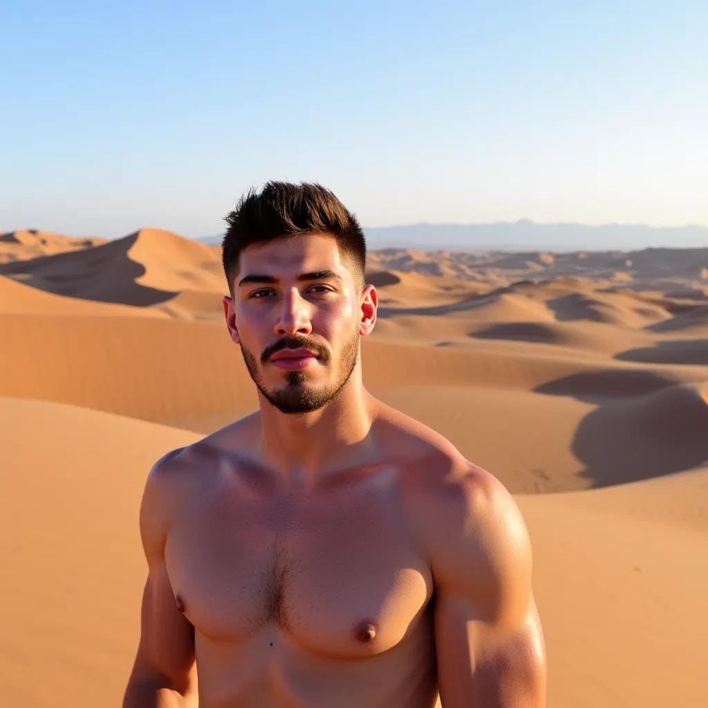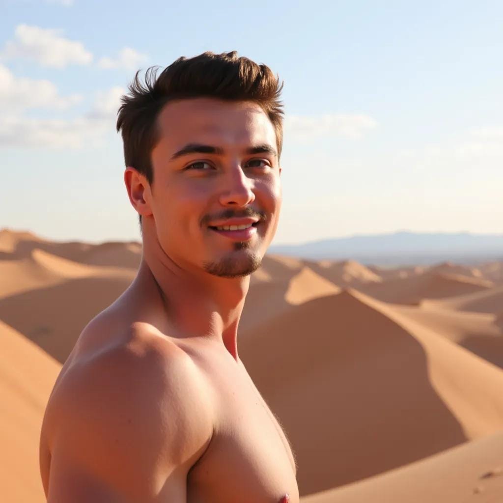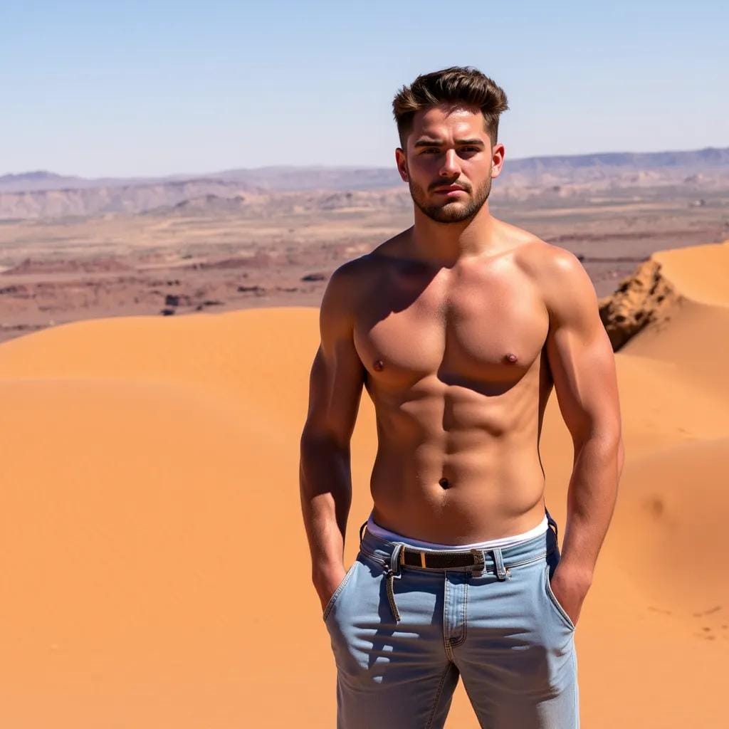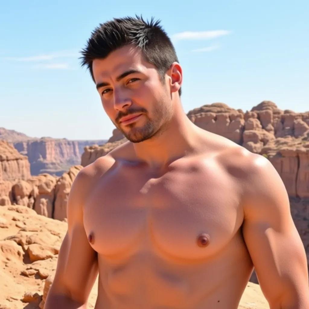 Beneath the sweltering desert sun, where endless dunes stretched towards the horizon like a sea of golden silk, Jack stood at the edge of a majestic canyon. His rugged features, chiseled from years of hard labor, glistened with a fine layer of sweat as he gazed out at the breathtaking vista. Yow! It's a hole all the way to downtown Burbank! he exclaimed, his deep voice carrying across the chasm, as he pointed a muscular arm towards the seemingly bottomless void. His companion, the enigmatic and beautiful Alex, stood beside him, her slender fingers wrapped around the worn leather strap of his camera.