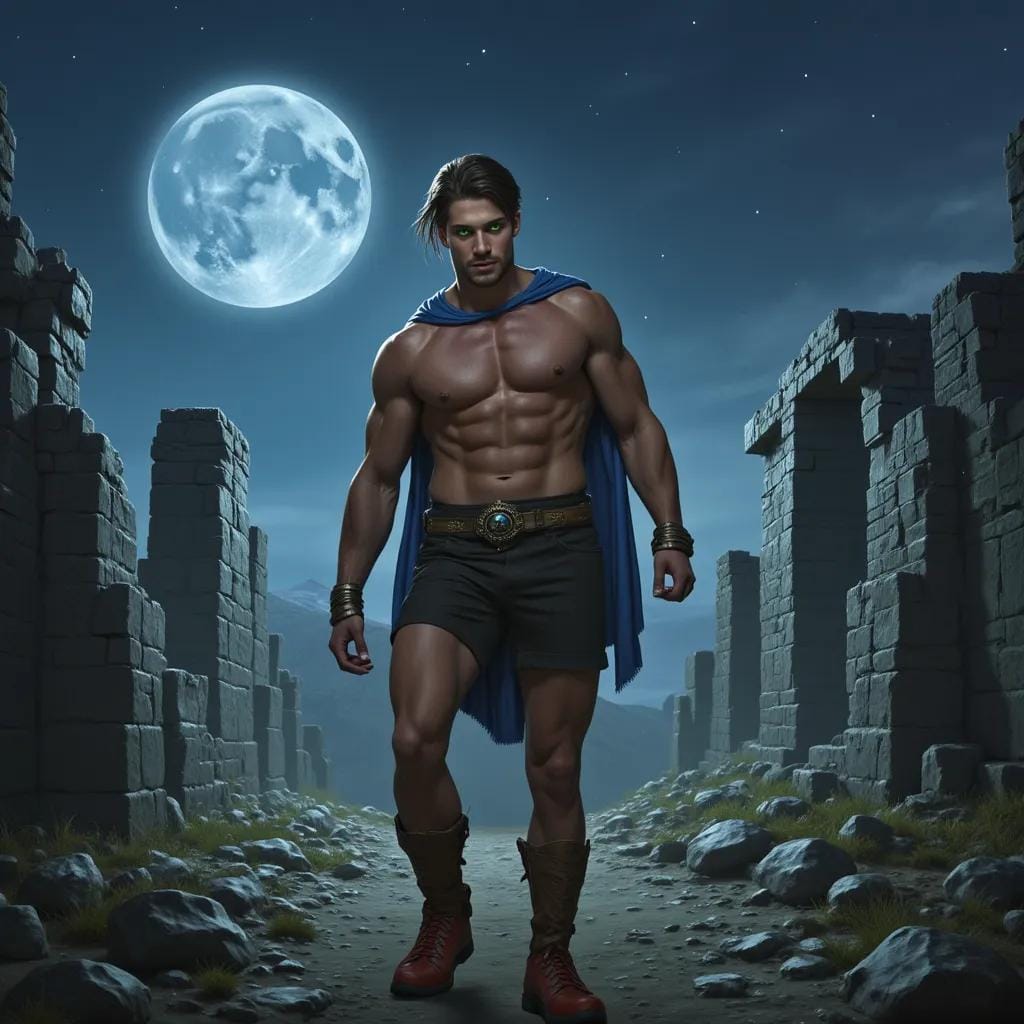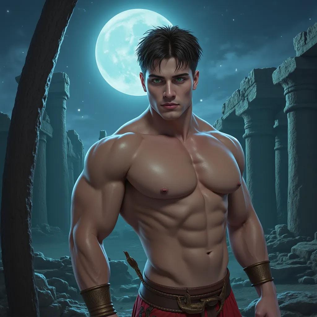 The moon cast an ethereal glow over the crumbling temple, its ancient stones worn smooth by the relentless tides of time. Amidst the ruins, a lone figure emerged, his piercing green eyes fixed intently on the figure before him.