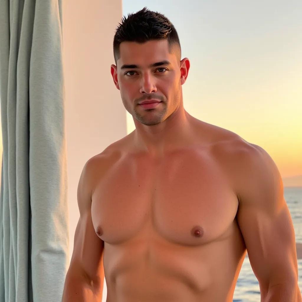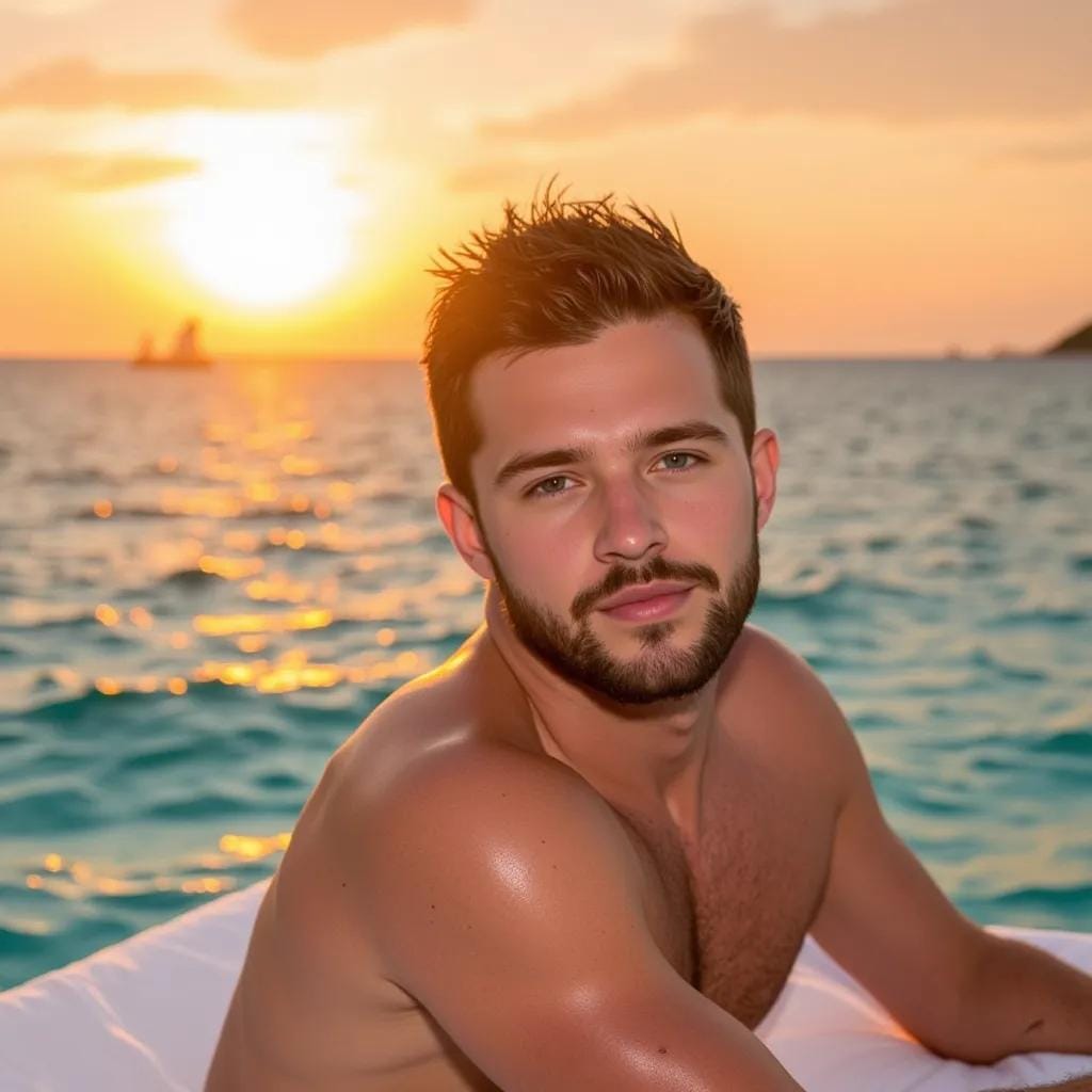 The sun had just begun to set over the turquoise waters of Bora Bora, casting a warm orange glow over the overwater bungalow where I lay on the king-sized bed. My eyes were fixed on the chiseled physique of my lover, Kael, as he stood at the edge of the deck, gazing out at the endless ocean. His broad shoulders, sculpted from years of surfing and weightlifting, seemed to ripple with the gentle breeze.