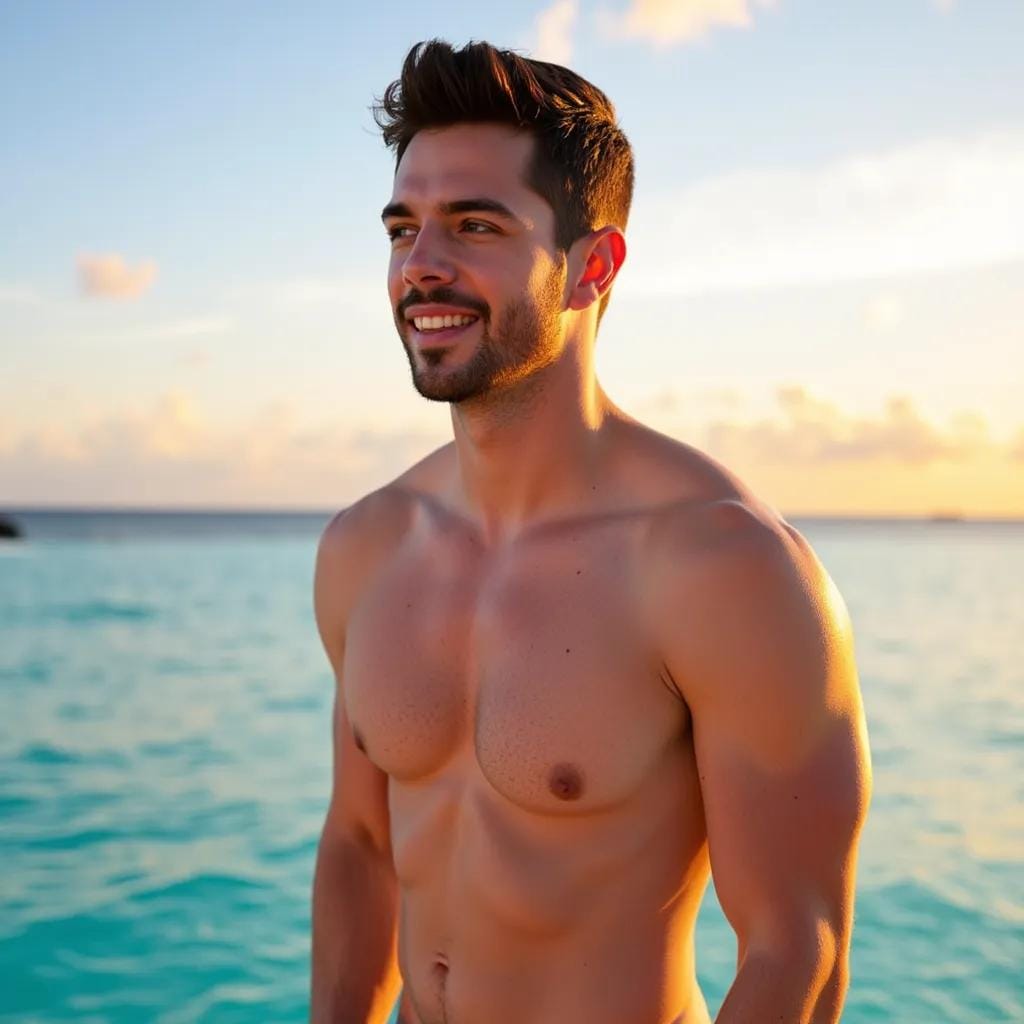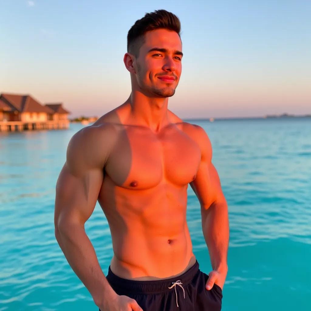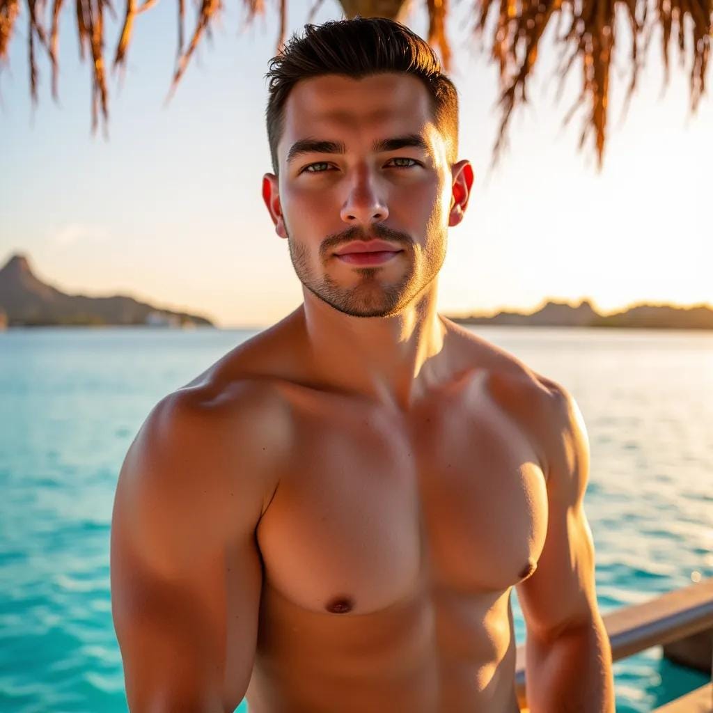 The sun had long since set over the crystal-clear waters of Bora Bora, casting a warm orange glow over the luxurious overwater bungalow where I stood, gazing out at the endless expanse of turquoise. My companion, a tall, bronzed Adonis named Kael, stood beside me, his chiseled physique a testament to his love of the ocean. "Don't be overly suspicious where it's not warranted," he whispered, his breath caressing my ear as he wrapped his arms around me from behind.
