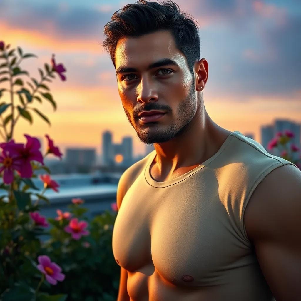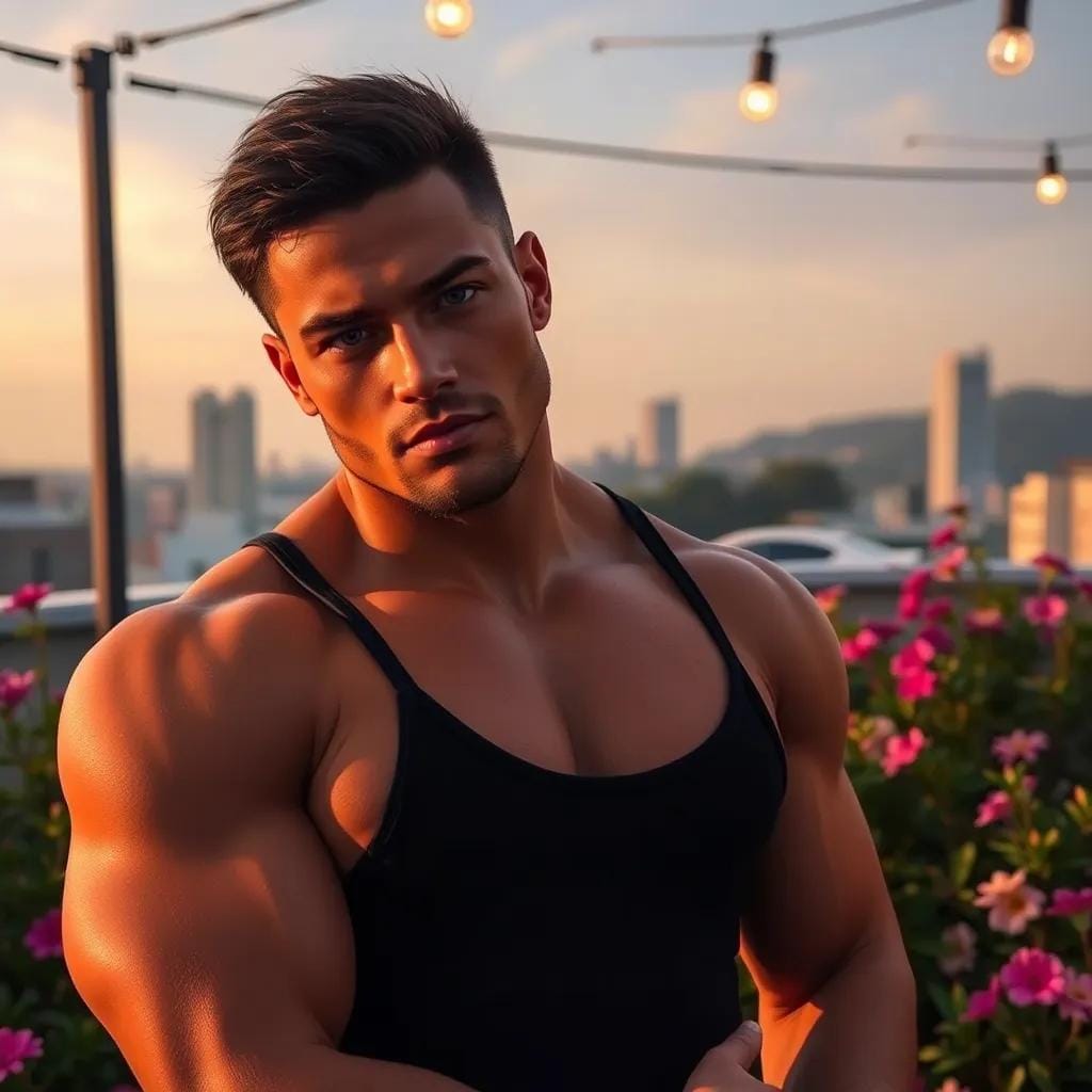 In the soft glow of the evening, the art gallery's rooftop garden became a tranquil oasis, its lush greenery and vibrant flowers a serene backdrop for the gentle romance unfolding between Omnic and Joy. As they strolled hand in hand, the city's twinkling lights below them, the air was alive with the sweet scent of blooming jasmine and the soft hum of conversation. Omnic's eyes, a deep shade of indigo, sparkled with delight as he gazed at Joy, her raven tresses dancing in the gentle breeze.