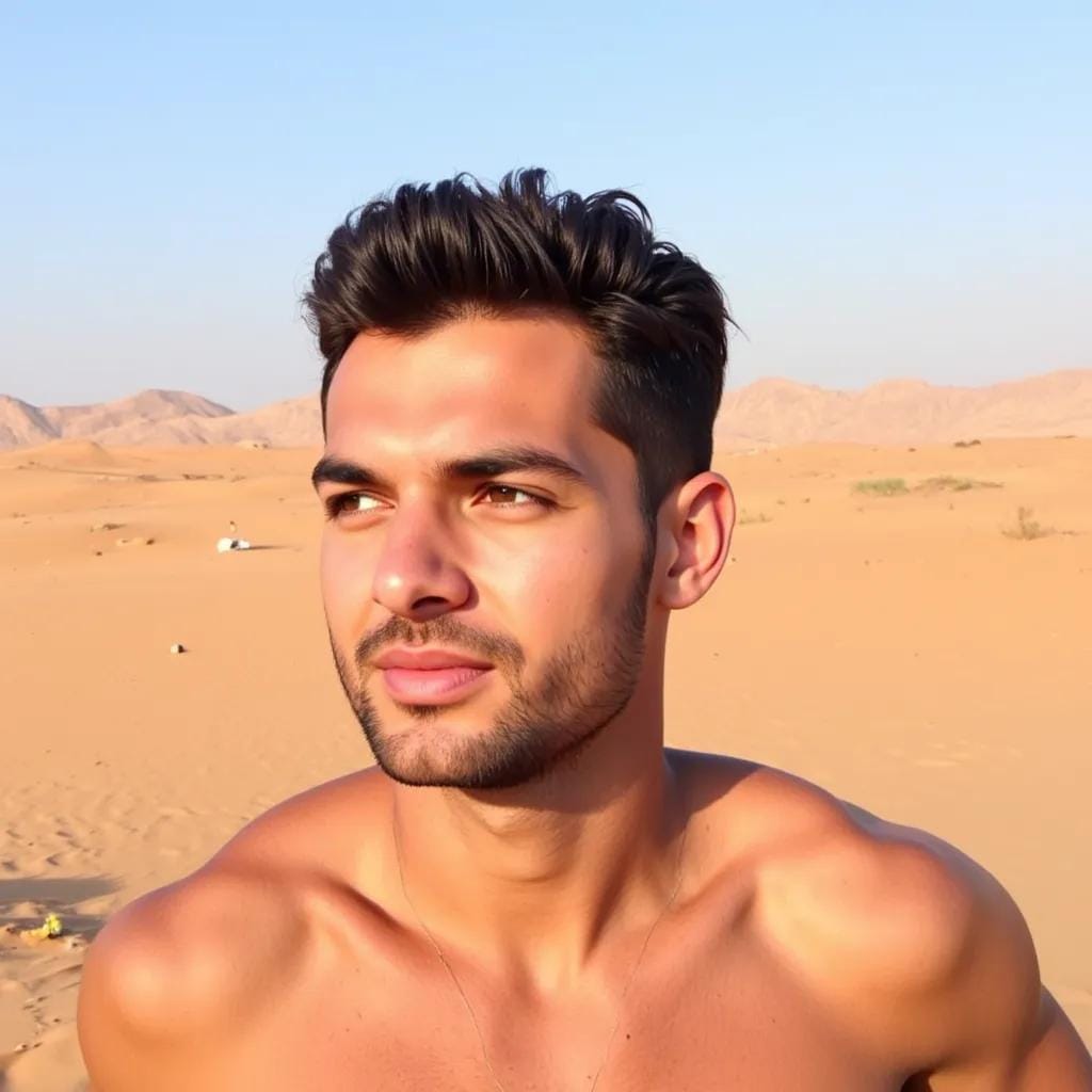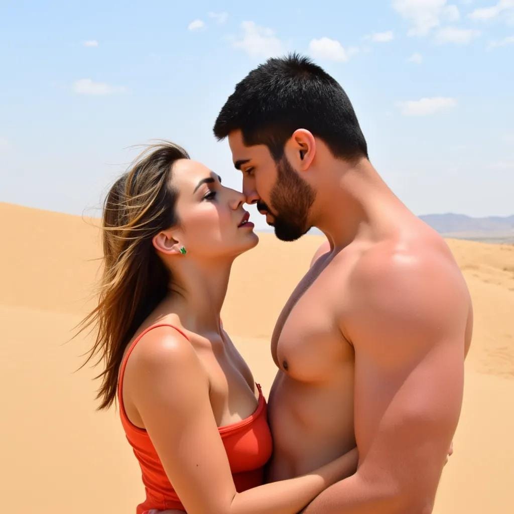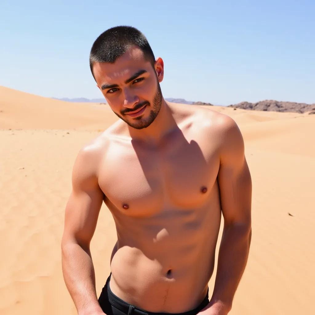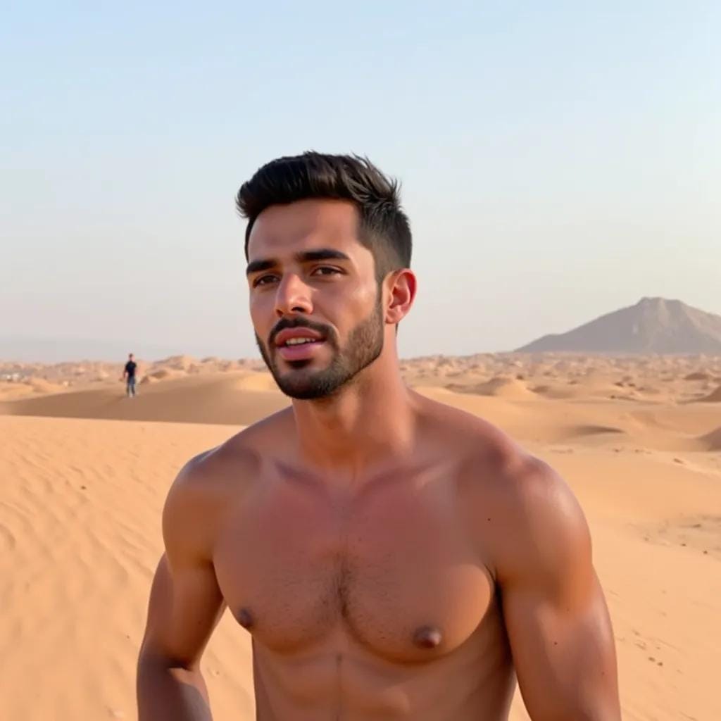 The scorching sun beat down on the sandy dunes of the Moroccan desert, where the majestic Atlas Mountains pierced the sky like shards of splintered stone. Amidst this unforgiving landscape, I found myself entwined with the enigmatic and breathtakingly handsome, Khalid. As we stood atop a towering dune, Khalid's piercing emerald eyes locked onto mine, his strong jawline set in a determined line.