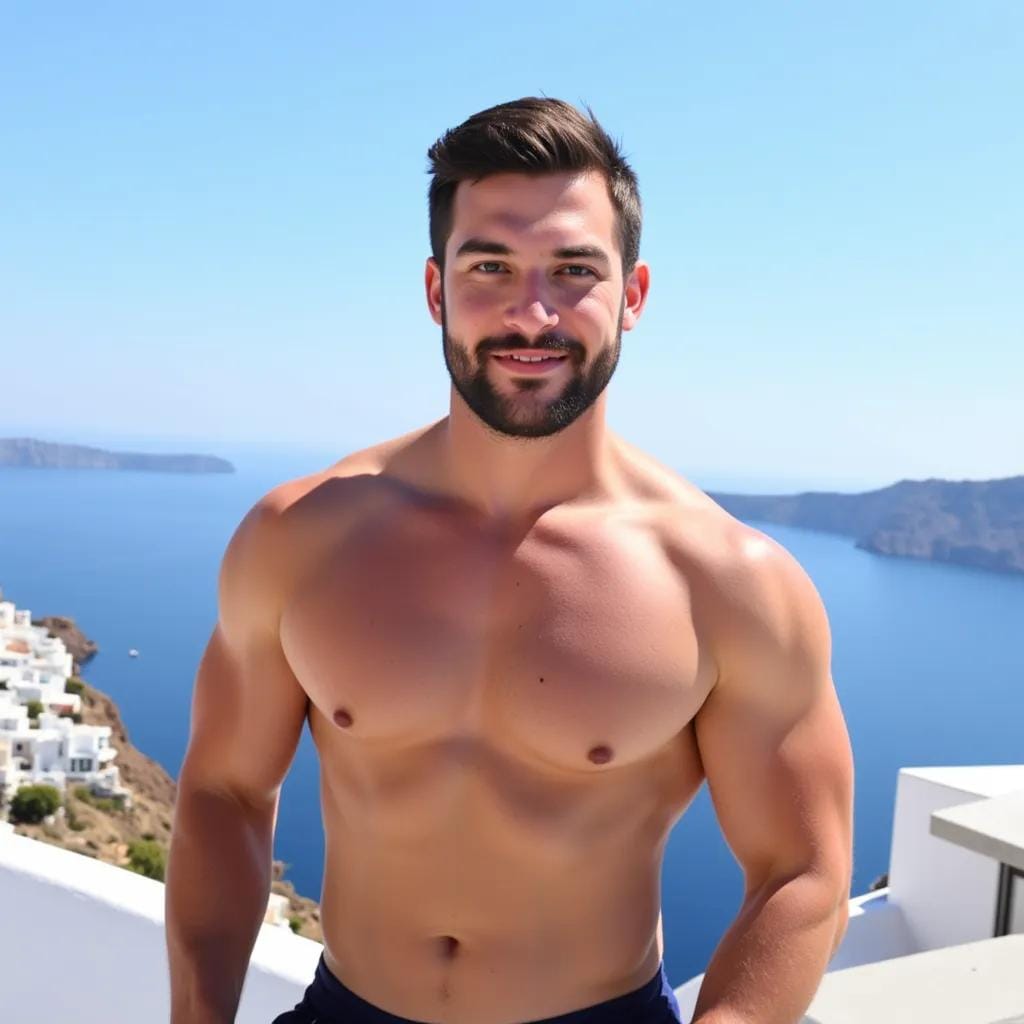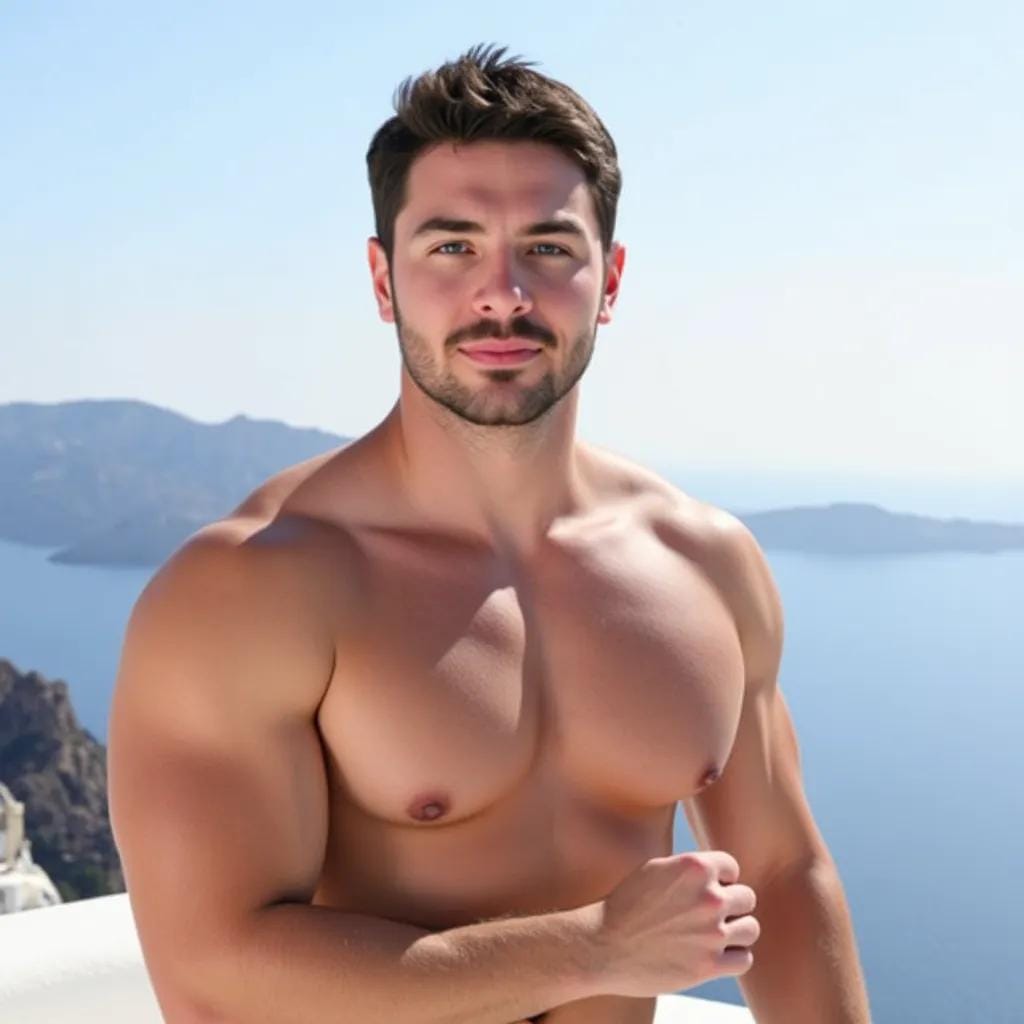 Below me, the whitewashed buildings and blue-domed churches seemed to shimmer in the fading light of day. It was here that I had met him, a ruggedly handsome stranger with piercing blue eyes and a strong jawline that seemed chiseled from the very stone of the Greek gods. His name was Andreas, and he was a sculptor, his hands deft and skilled as he worked the marble into shapes of breathtaking beauty. As we stood on the rooftop, the air was alive with tension, the scent of lemon and olive trees wafting up from the gardens below.