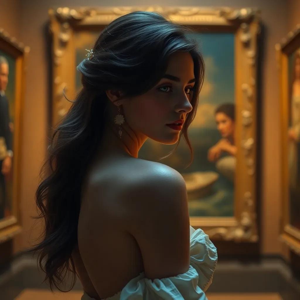 In the hushed, golden light of the art gallery, where masterpieces whispered secrets to one another on the walls, Emma found herself lost in the gaze of a stranger. His eyes, like two dark pools of mystery, seemed to hold a world of emotions, a universe of unspoken thoughts.