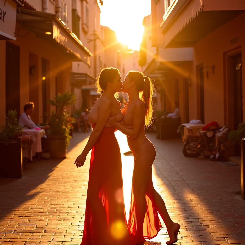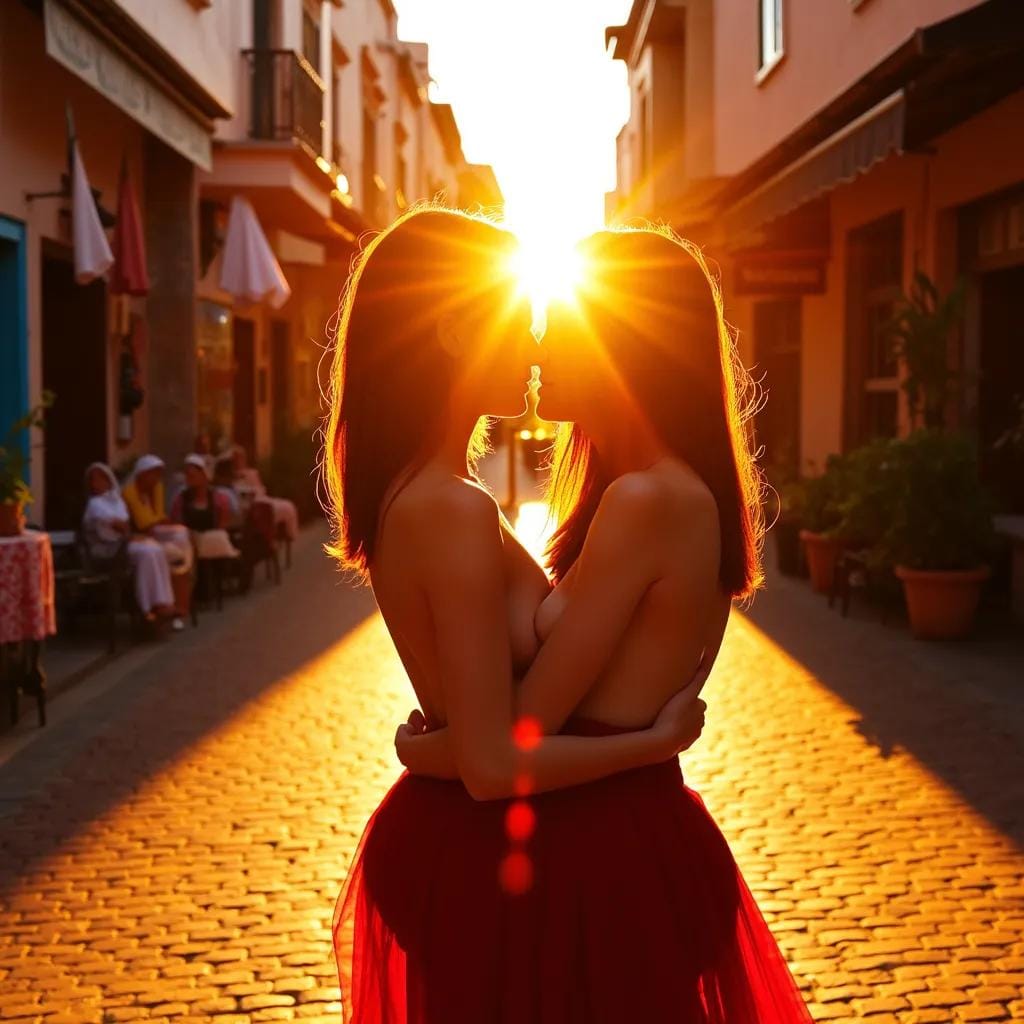 The warm golden light of the Moroccan sunset danced across the terracotta tiles of the ancient medina, casting a sensual glow over the narrow alleys and quaint shops. Amidst this vibrant backdrop, a chance encounter unfolded, one that would leave its participants breathless and forever changed. Amira, a ravishing beauty with skin as dark as the night sky and hair as wild as the desert winds, had wandered into the medina, drawn by the sweet scent of jasmine and the promise of adventure.