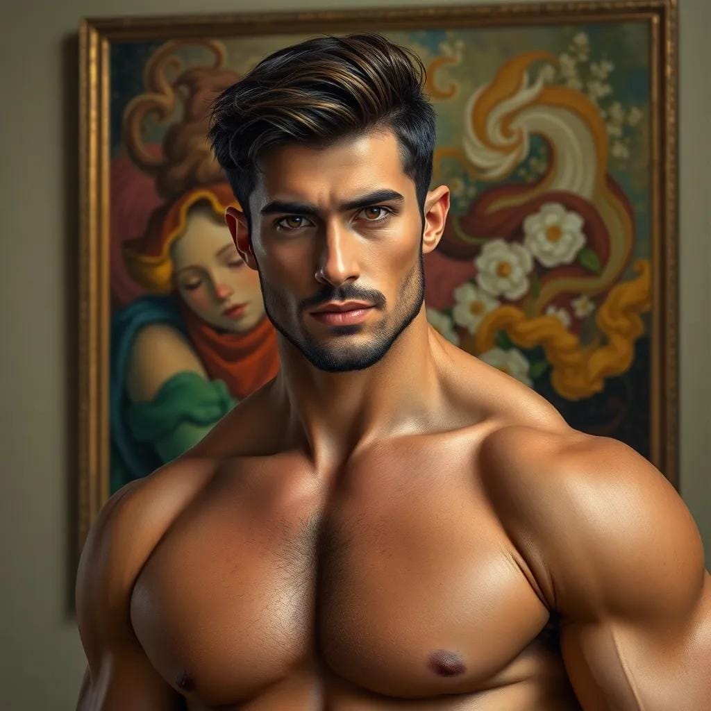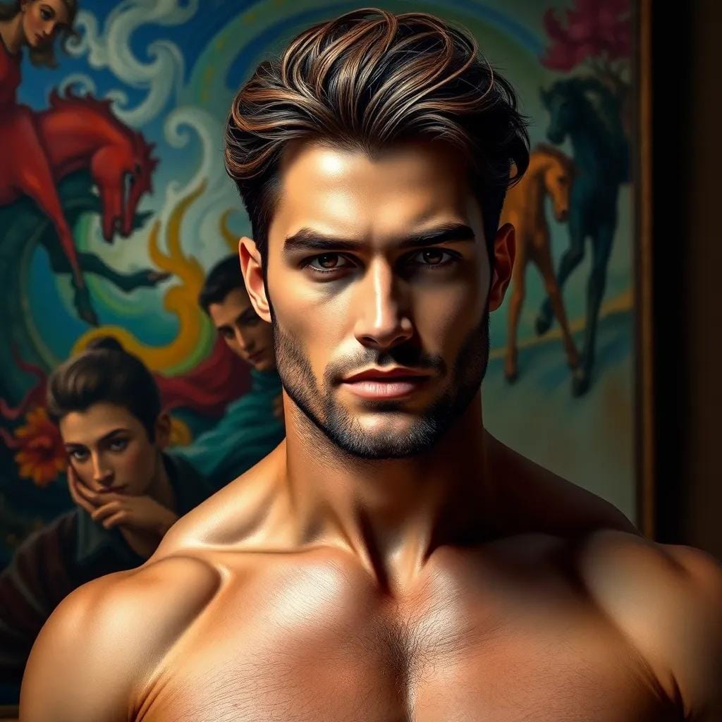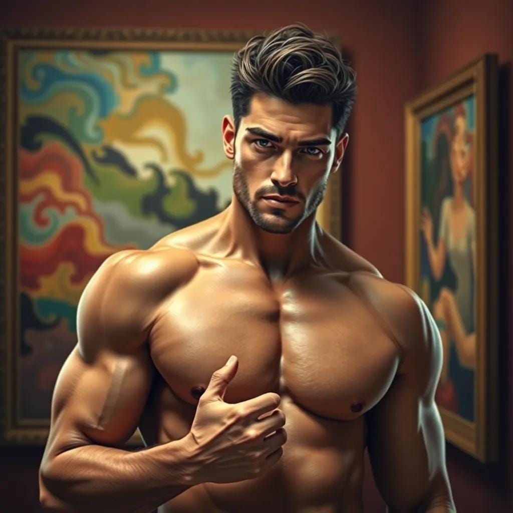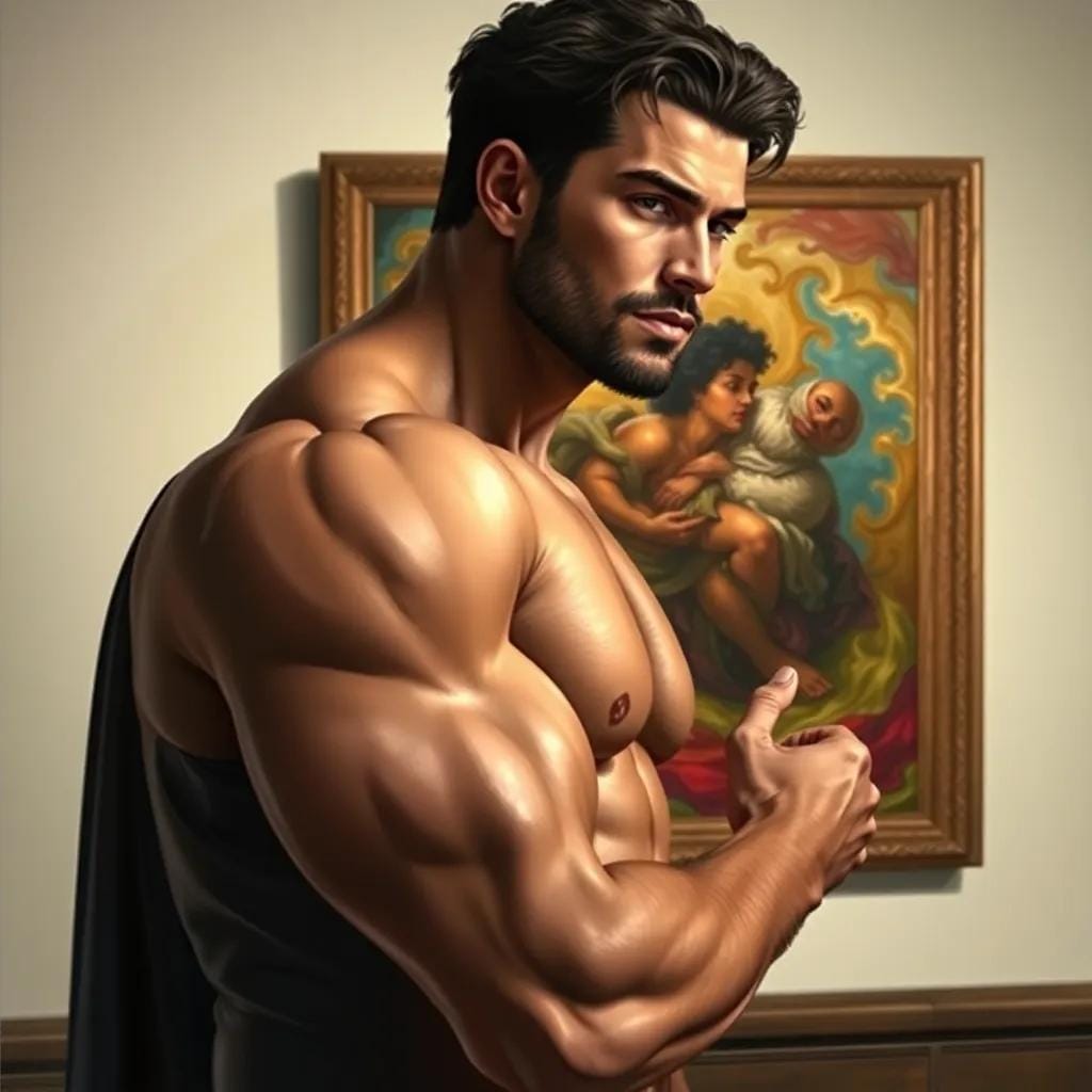 "What do you see in this?" he asked, his voice low and husky, as if the very words were a caress. She turned to him, her eyes locking onto his, and for a moment, the world around them melted away. "I see the turmoil of the soul," she whispered, her voice barely audible over the hum of the gallery. "The struggle to find balance in a world that's constantly in motion." He nodded, his eyes crinkling at the corners as he smiled. "I see that too," he said, his voice filled with a deep understanding.