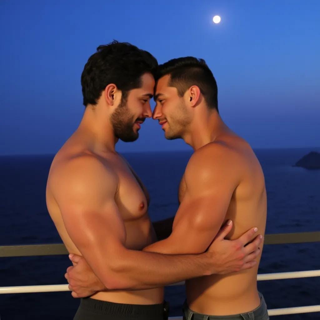 "How do I love thee? My accumulator overflows," whispered Marcus, his eyes locked onto the chiseled physique of his lover, Atlas, as they stood on the moonlit rooftop of a luxury villa overlooking the turquoise waters of Bora Bora. Atlas, a Greek god in the flesh, with a rugged jawline and piercing blue eyes, had been modeling for Marcus's latest photography project. The air was heavy with anticipation as Marcus's lens captured every curve and contour of Atlas's powerful physique. As the sun dipped below the horizon, Marcus led Atlas to the villa's private pool, where a candlelit dinner awaited.