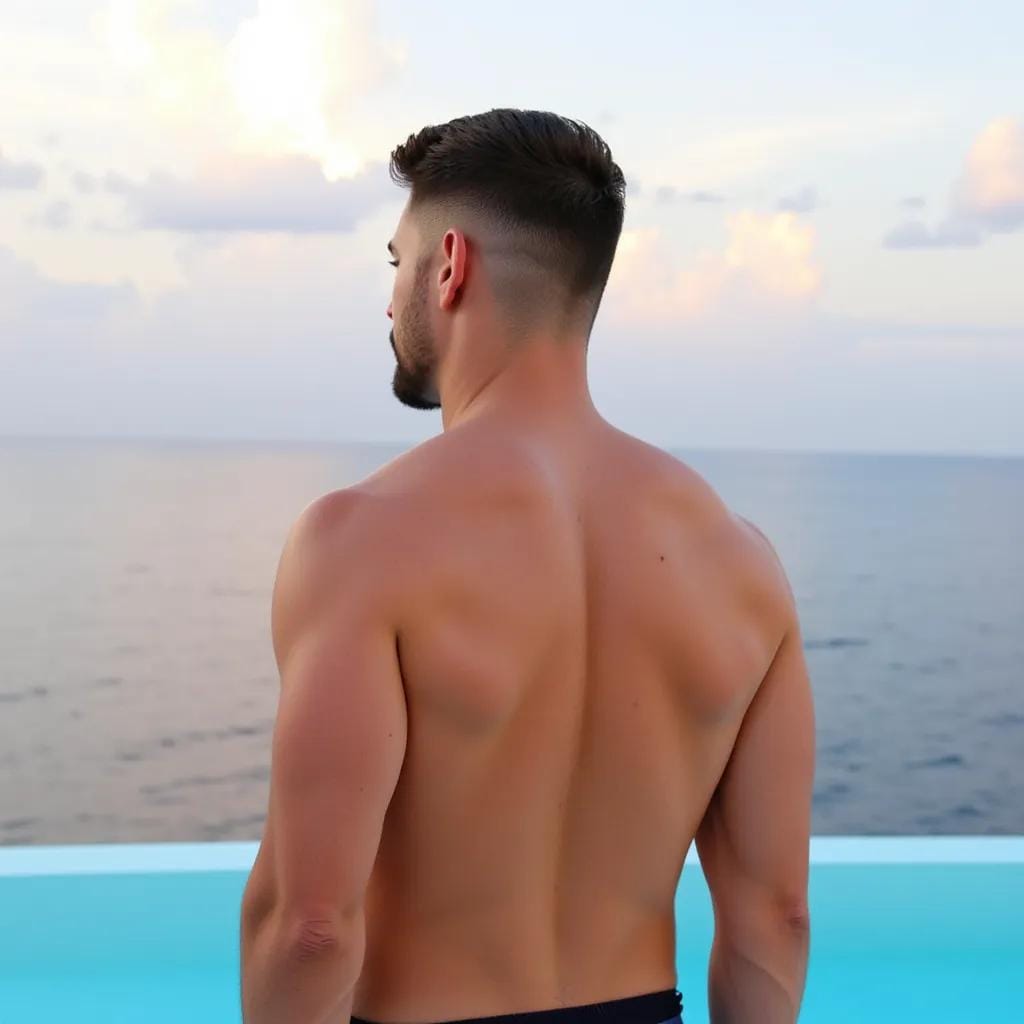 As the last wisps of sunlight surrendered to the horizon, Maximilian De Santos stood at the edge of the infinity pool, gazing out at the endless expanse of turquoise water. His chiseled features, a testament to hours spent beneath the scorching Mediterranean sun, seemed to shimmer in the fading light. "This is a good time to punt work," he said to his companion, a statuesque beauty named Alessia, as he shed his tailored suit and slipped into the cool, clear water. Alessia's eyes sparkled with amusement as she joined him, her long, dark hair rippling behind her like a waterfall.