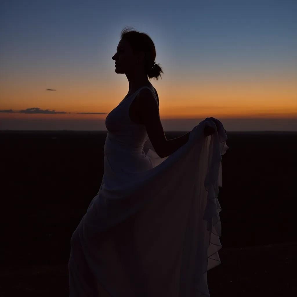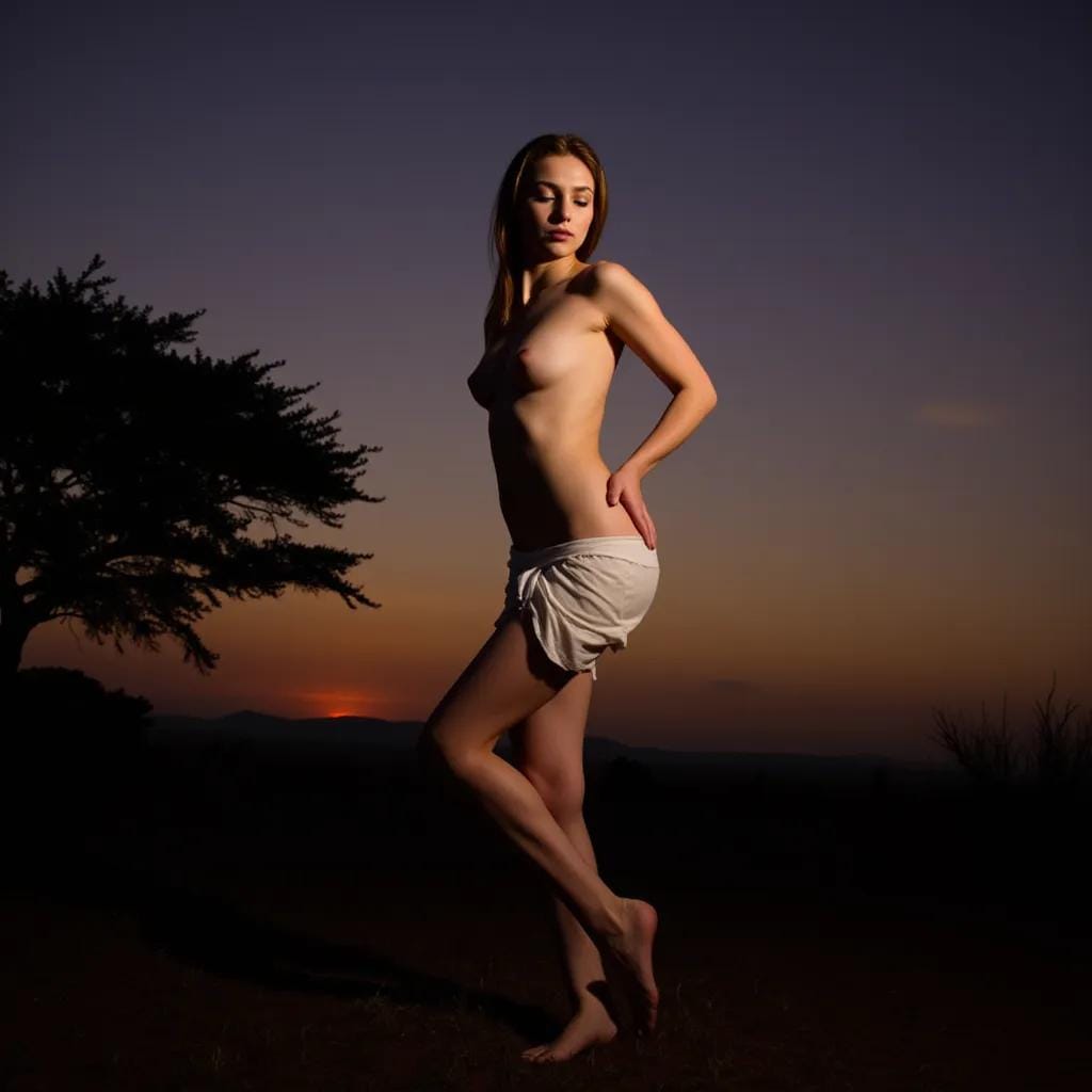 "Midnight Mirage on the Serengeti" As the last wisps of sunset dissolved into the Tanzanian horizon, a lone figure emerged from the shadows of a luxury safari lodge. She was a vision in moonlit ivory, her slender form draped in a flowing white gown that seemed to shimmer with an ethereal light.