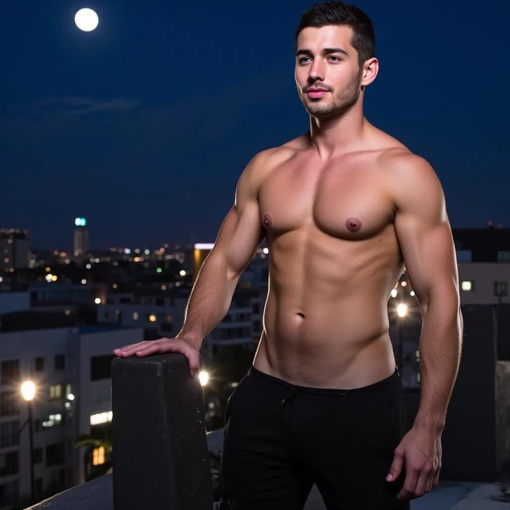 The warm breeze danced across the moonlit rooftop, carrying the sweet scent of blooming jasmine as Alessandro stood at the edge, his eyes fixed on the silhouette of his companion, Luca. The city below was a canvas of twinkling lights, a reminder of the world's beauty and chaos. "Can you imagine how life could be improved if we could do away with jealousy, greed, hate?" Alessandro's voice was low and husky, a gentle caress that sent shivers down Luca's spine. Luca turned to him, his eyes locking onto the sharp jawline, the chiseled cheekbones, and the full lips that curled into a seductive smile.