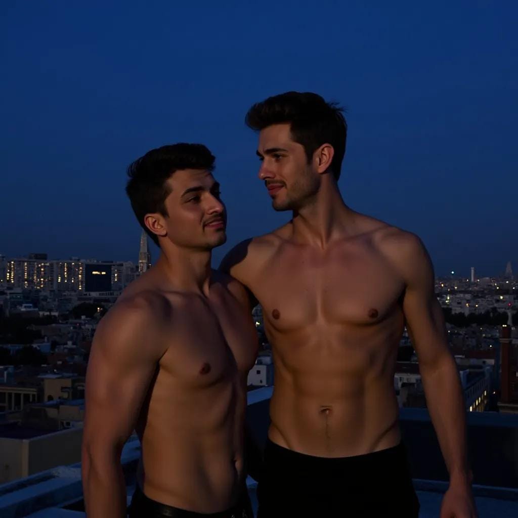 The rooftop, the city, the world – it all melted away, leaving only the thrum of their hearts, beating in perfect sync. Alessandro's fingers dipped lower, tracing the line of Luca's spine, and Luca's eyes fluttered closed, his body arching into the touch. The world was a canvas of possibilities, and they were the artists, painting a masterpiece of desire, one touch at a time.