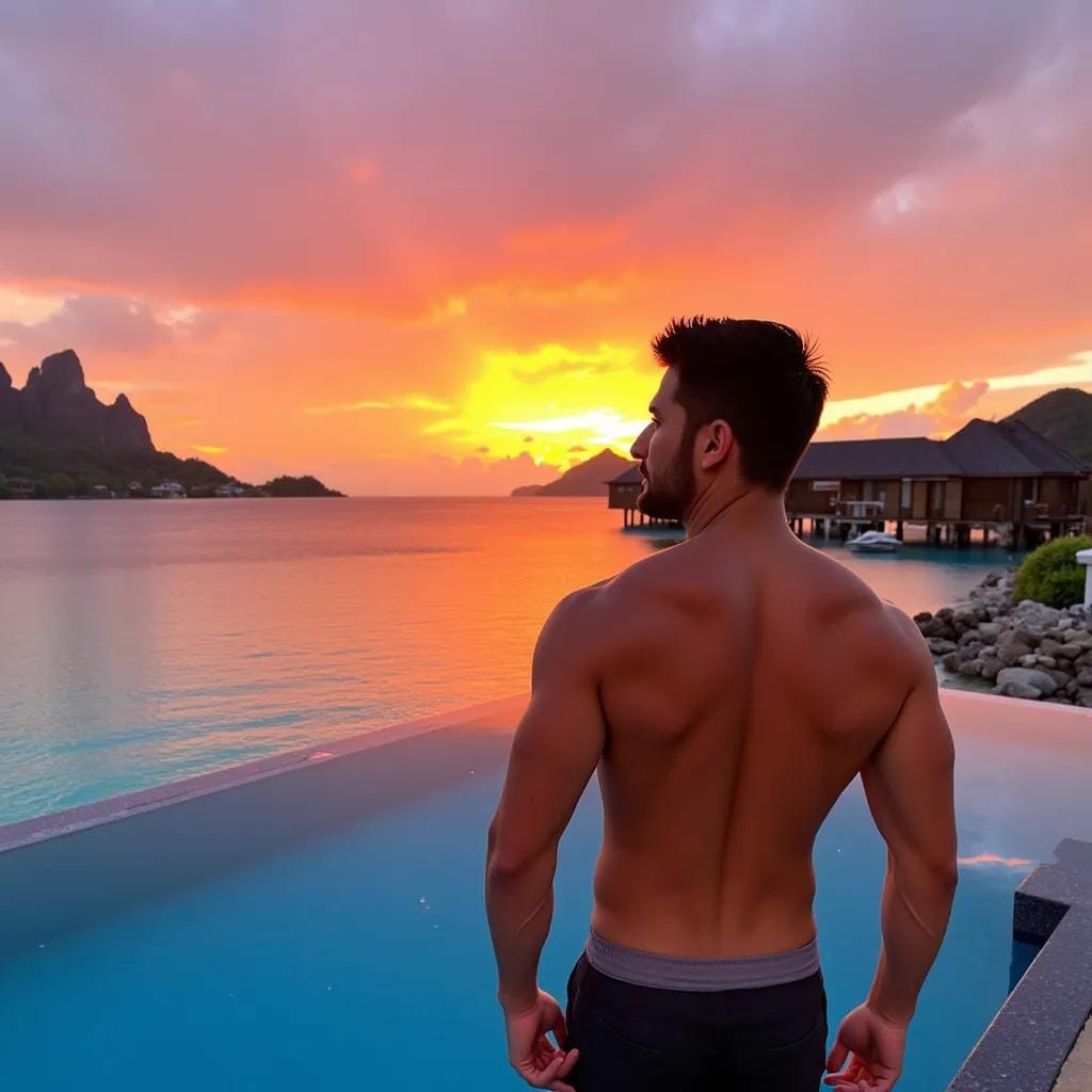 The sun had long since dipped into the horizon, casting a warm orange glow over the tranquil waters of Bora Bora. Woody, a ruggedly handsome adventurer, stood on the edge of the infinity pool, gazing out at the breathtaking view.