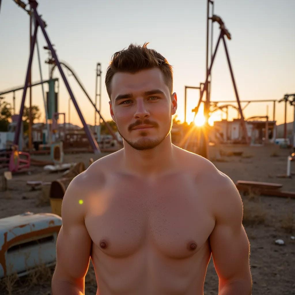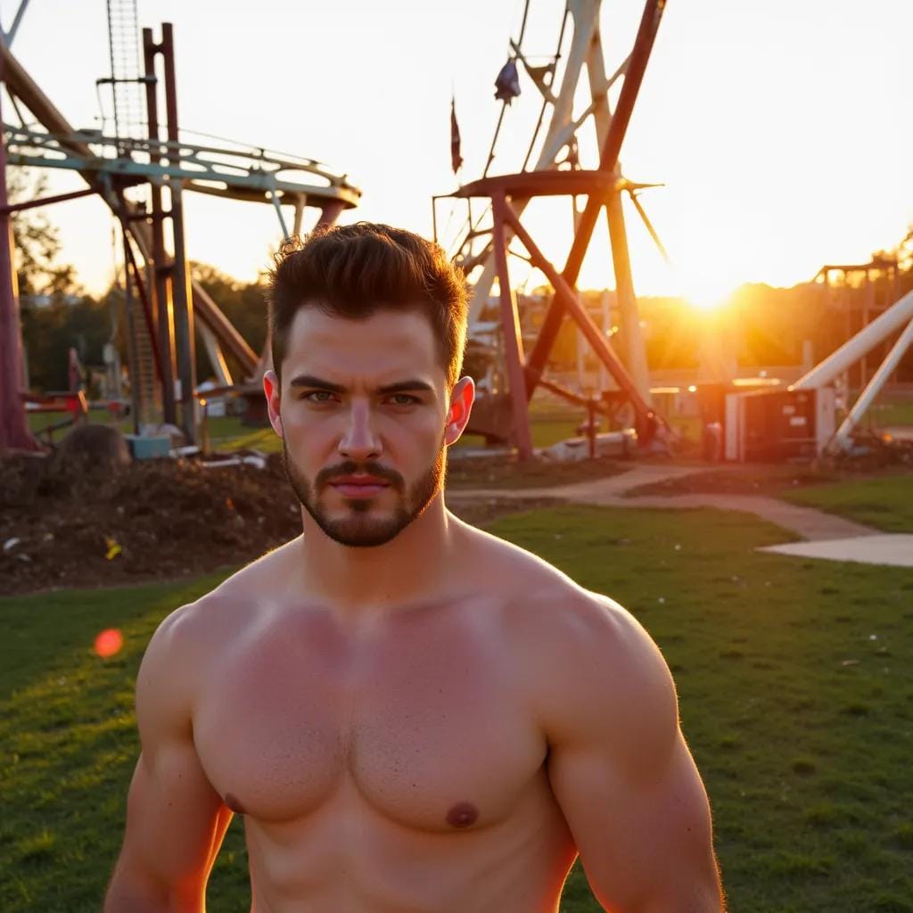 It was the man standing beside me, his chiseled features illuminated by the fading light. He was a giant of a man, with broad shoulders and a chest that seemed carved from granite. His eyes were a deep, piercing blue, and they seemed to see right through me. I felt a shiver run down my spine as he reached out and took my hand, his touch sending a jolt of electricity through my body. "Well, it's garish, ugly, and derelicts have used it for a toilet," he said, his voice low and husky. "The rides are dilapidated to the point of being lethal, and could easily maim or kill innocent little children." I laughed, feeling a sense of excitement build inside me. "Oh, so you don't like it?" I asked, my voice barely above a whisper. "Don't like it?" he repeated, his eyes glinting with amusement.