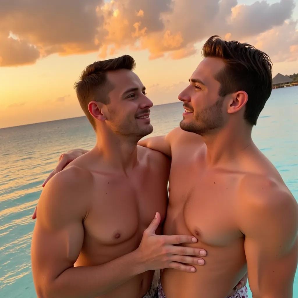 The sun had long since set over the tranquil waters of Bora Bora, casting a warm orange glow over the luxurious overwater bungalow where Julian and Alexander were ensconced. Alexander, a mad artist with an unbridled passion for the human form, had convinced Julian, a stunningly handsome model, to pose for him on this remote island paradise. As Julian stood on the edge of the deck, the gentle lapping of the waves against the hull providing a soothing melody, Alexander set up his easel and canvas.