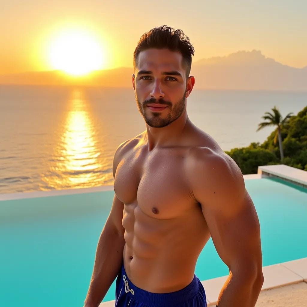 As the golden sun dipped into the turquoise horizon, casting a warm glow over the secluded island, Alessandro stood at the edge of the infinity pool, his chiseled physique glistening with dew. His rugged jawline, a testament to his Italian heritage, seemed chiseled from the very stone of the Mediterranean. Before him, the pool's glassy surface reflected the vibrant colors of the setting sun, a kaleidoscope of pinks, oranges, and purples that danced across the water.