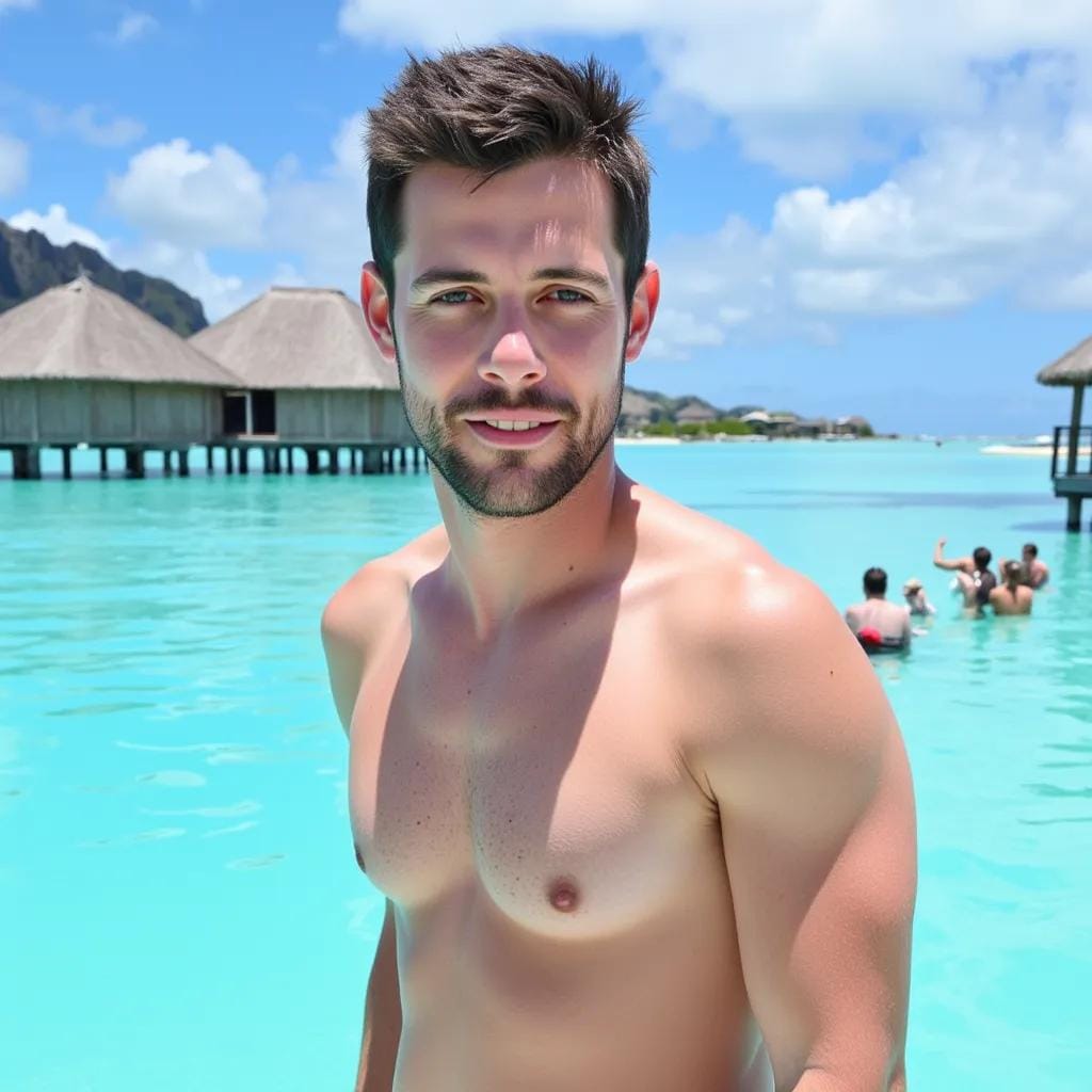 The turquoise waters lapped gently against the shore, a stark contrast to the turmoil brewing within me. My eyes locked onto him, a vision of masculinity standing at the edge of the lagoon, his chiseled physique glistening with sweat. Kael, a rugged Australian model, had been booked for a high-end fashion shoot on the island.