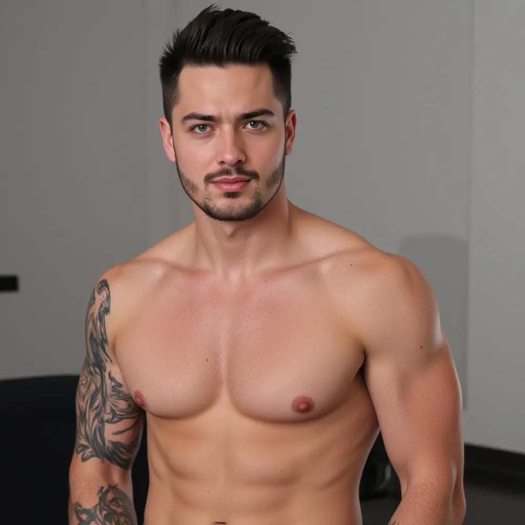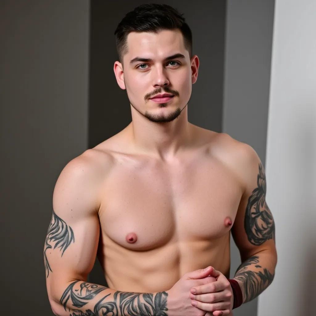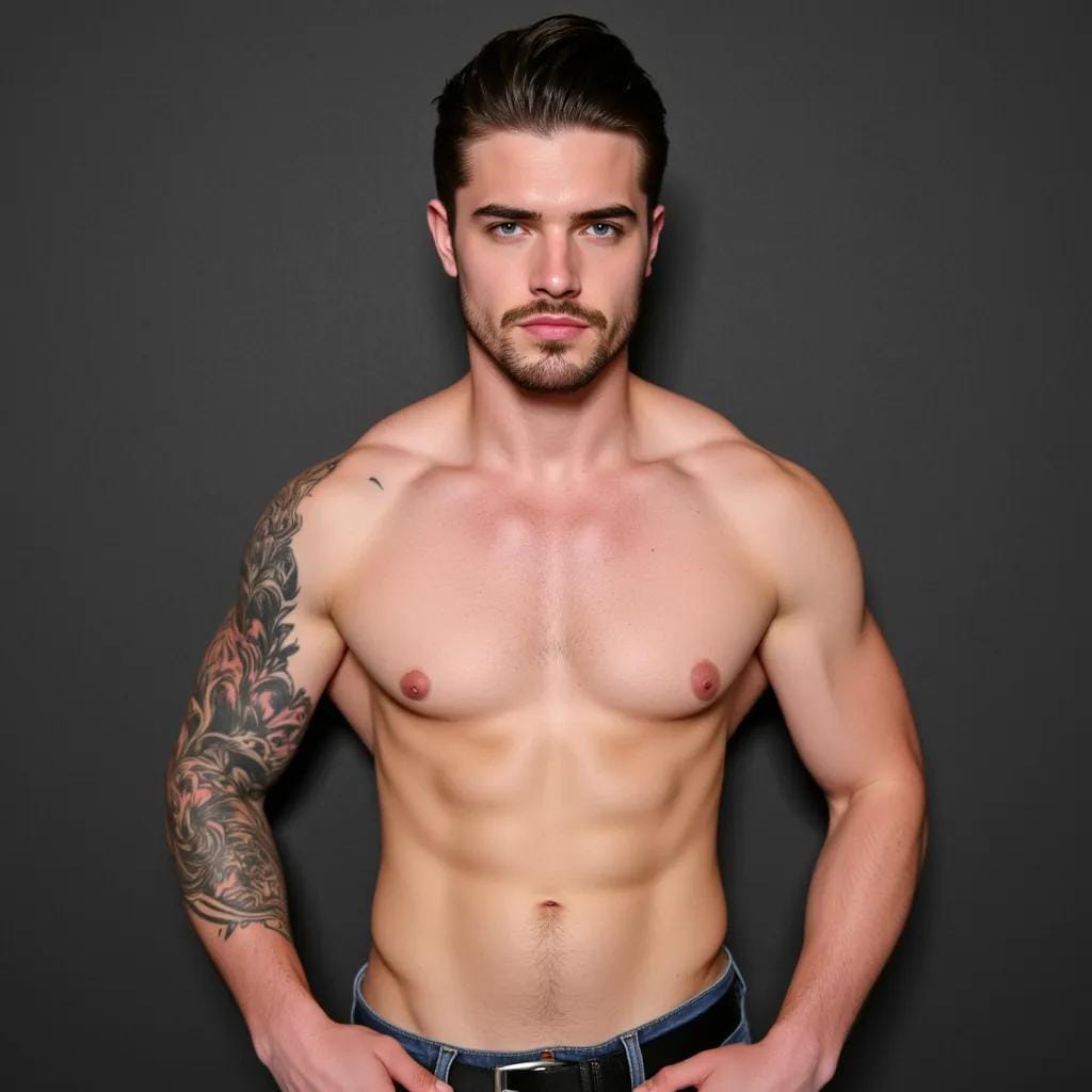 "Rebel's Awakening" Kai, a brooding, tattooed artist, stood before me, his chiseled physique radiating an air of confident rebellion. His eyes, a piercing blue, seemed to challenge the very notion of authority as he strode into the dimly lit art gallery, his broad shoulders rolling beneath his black leather jacket.